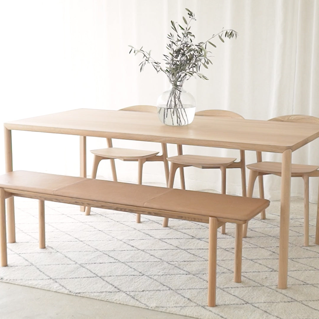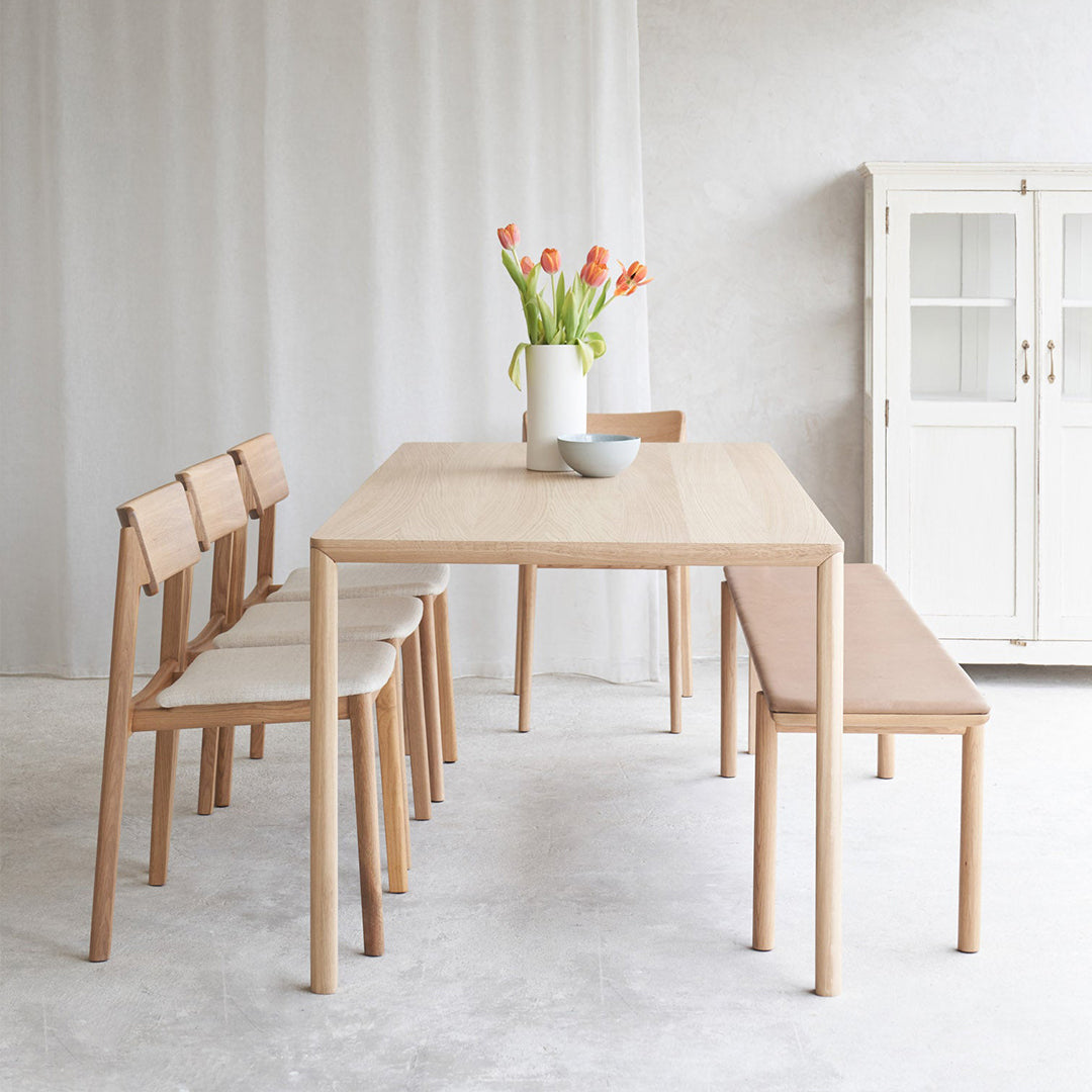 With sleek bevelled legs, the tabletop seems to float effortlessly above. The Oak Air is a strong and lean dining table disguised in a simple, clean and minimal design. Inspired by the lightness experienced with the bed of the same name.