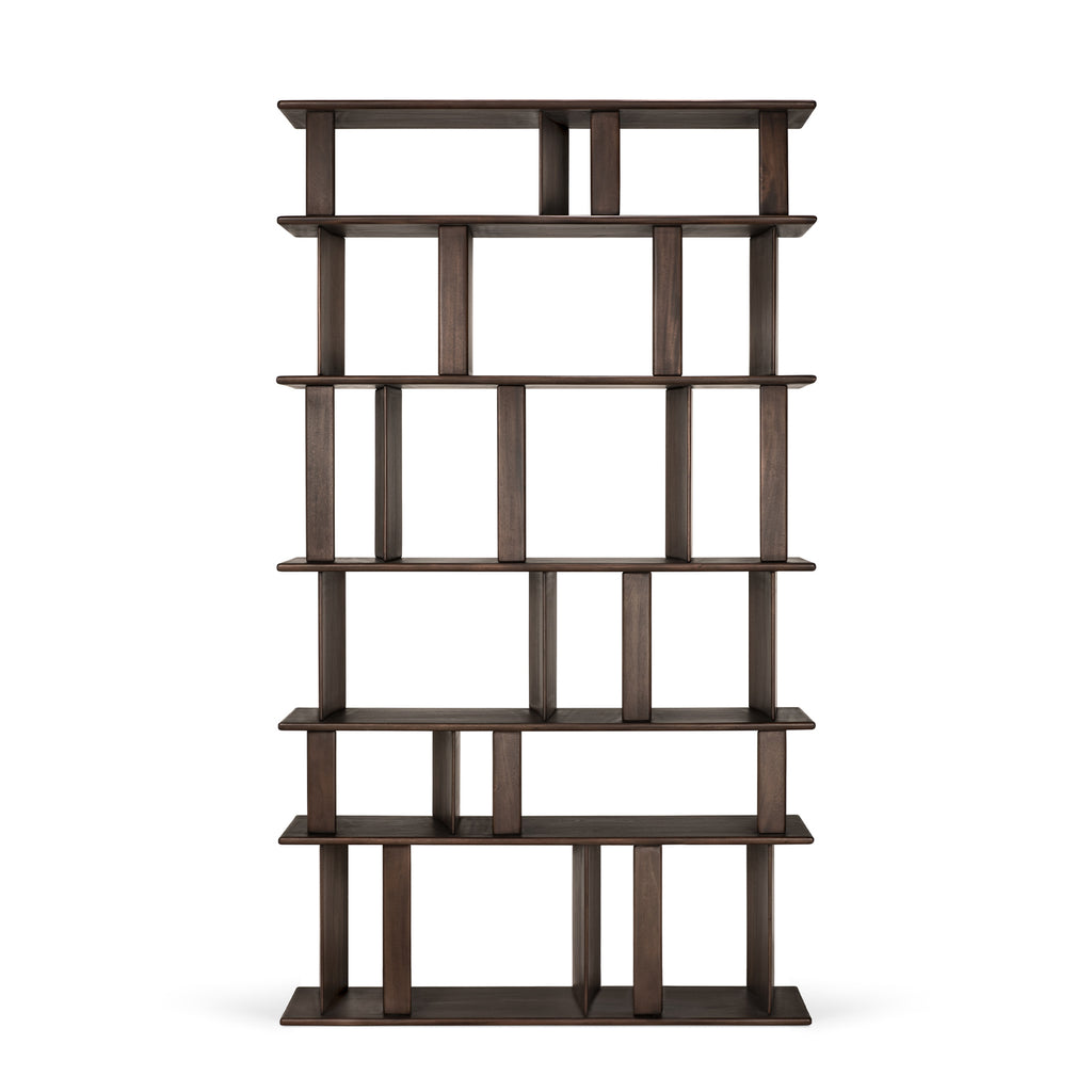 The Block Rack is crafted from solid mahogany and features angular dividers with an open design for versatile storage. Its clean lines and sculptural form add a touch of modern character to any space. Made from espresso stained mahogany. For regular care, wipe the surface with a dry (lint-free) cloth.