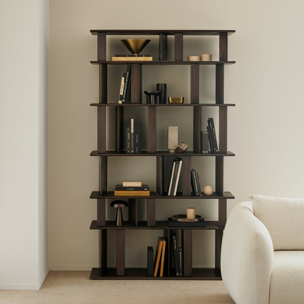 The Block Rack is crafted from solid mahogany and features angular dividers with an open design for versatile storage. Its clean lines and sculptural form add a touch of modern character to any space. Made from espresso stained mahogany. For regular care, wipe the surface with a dry (lint-free) cloth.