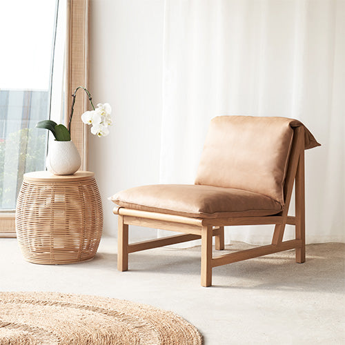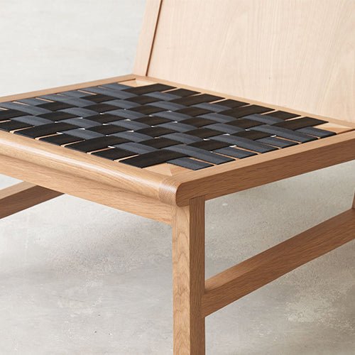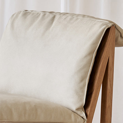 The Cantaloupe Armchair blends modern sophistication with timeless elegance, featuring a stark wooden frame supporting a slack futon form atop woven seat-belt webbing. An overhanging back pillow flips forward for added support, creating a distinctive silhouette ideal for both residential and commercial spaces.