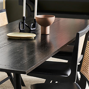 This dining table is handcrafted from black-stained solid American oak. The Coco dining table's basic design highlights the wood's natural charm. Rounded legs nestle into the safe coves of the top to create an understated, yet sophisticated, design language. Finished with a hard-wearing clear satin lacquer finish which keeps it looking good and ensures easy maintenance. Flat-packed, assembly on delivery. To protect the surface from heat and prevent marks and stains, always use a trivet or a coaster underneath hot plates, pans, or mugs. Use felt stoppers when you place decorative objects on the surface to prevent scratches or marks. Do not place sharp or jagged objects directly on the tabletop. For oil and food stains use a damp cloth to wipe stains and follow with a clean dry cloth.
