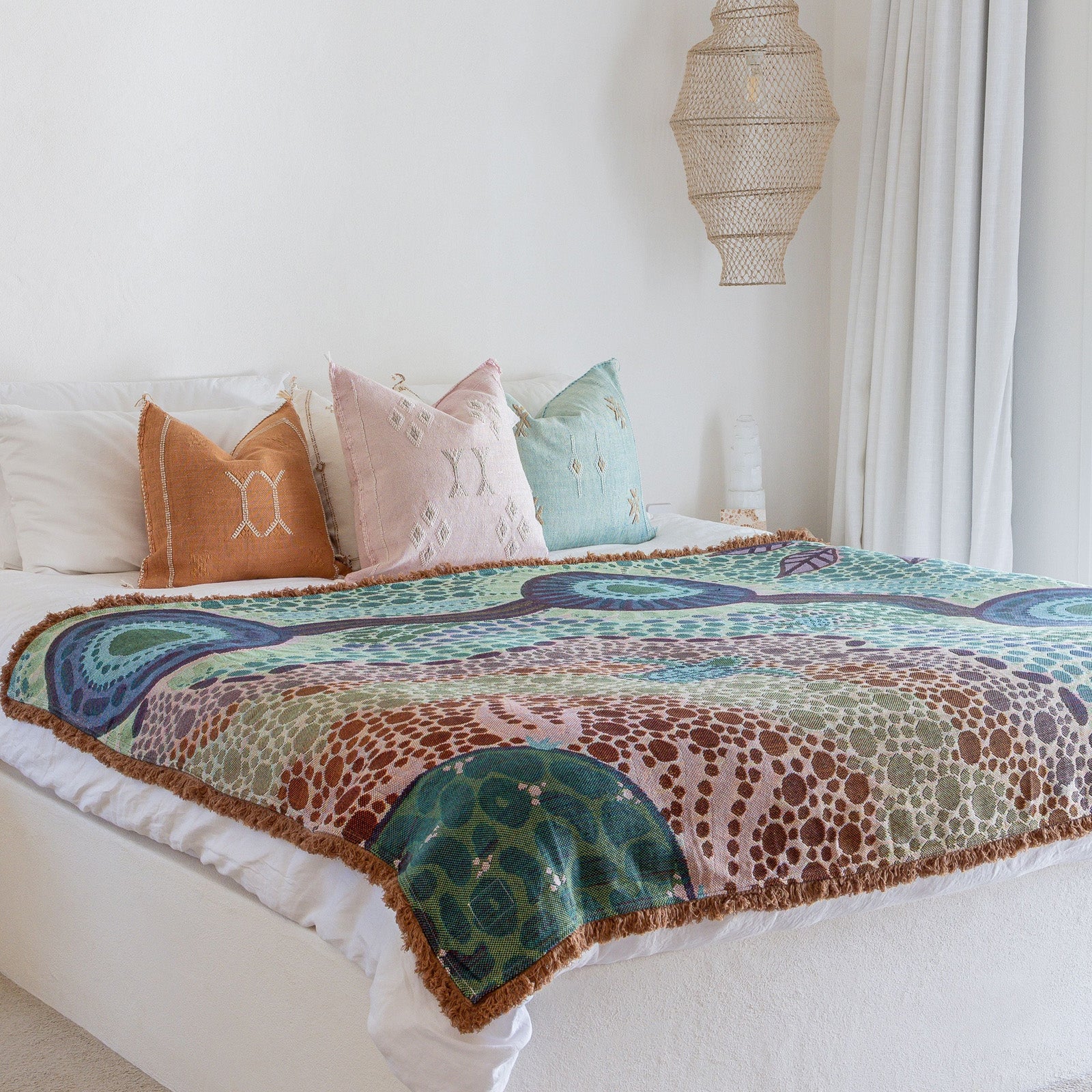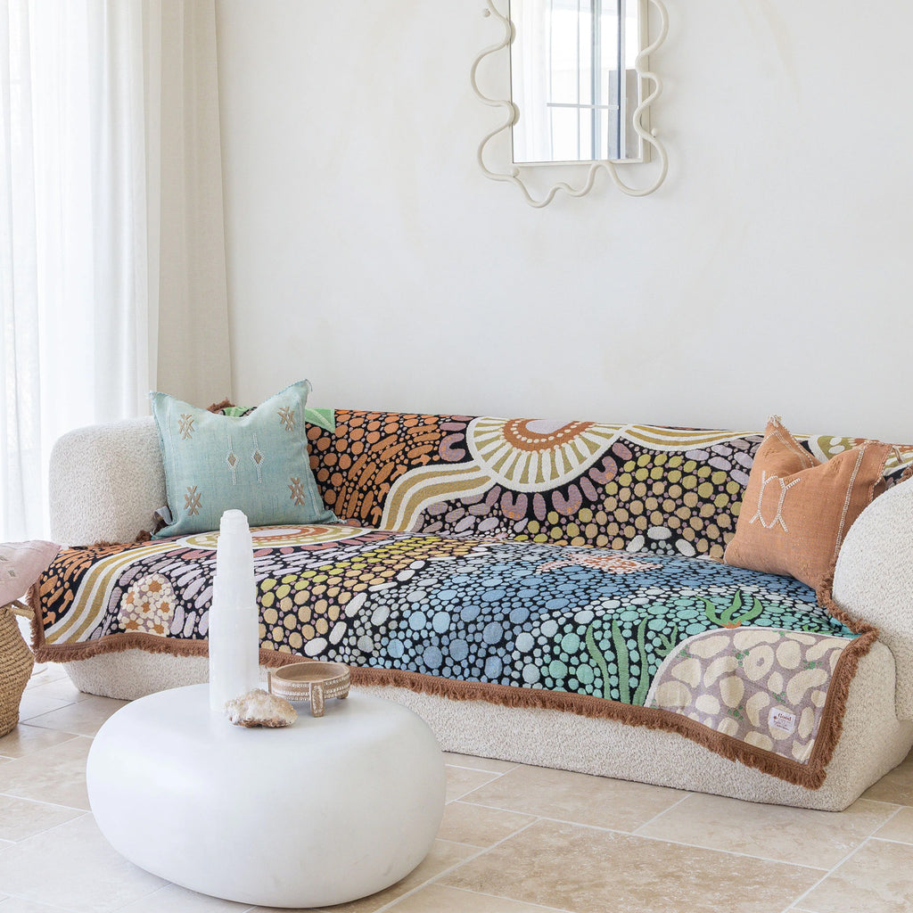 The Buggeiri Throw is a vibrant storytelling piece that celebrates persistence and optimism within Aboriginal and Torres Strait Islander culture. Rich ocean blues flow into golden shores of hope, crossed by unbroken travelling tracks that symbolise determination across generations, while red ochre land and a sacred eucalyptus tree honour a deep spiritual connection to Country.