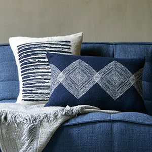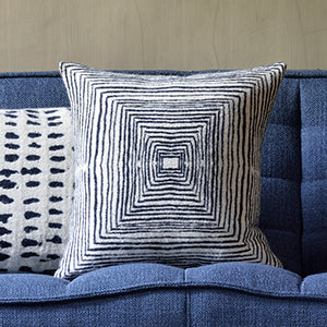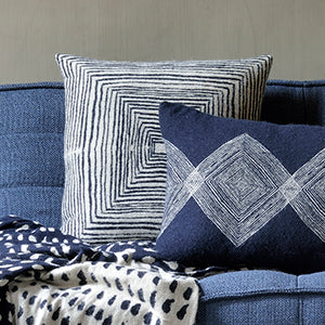 Mirroring the way ink reacts to handmade paper, painterly forms come alive woven into the cushions of the Mystic Ink collection. The intensity of the Yves Klein blue and dark chocolate perfectly plays off the classic painterly dashes, stripes and shapes. Organic vibes with a graphic edge produce a distinctive collection that perfectly complements the wider textiles range.