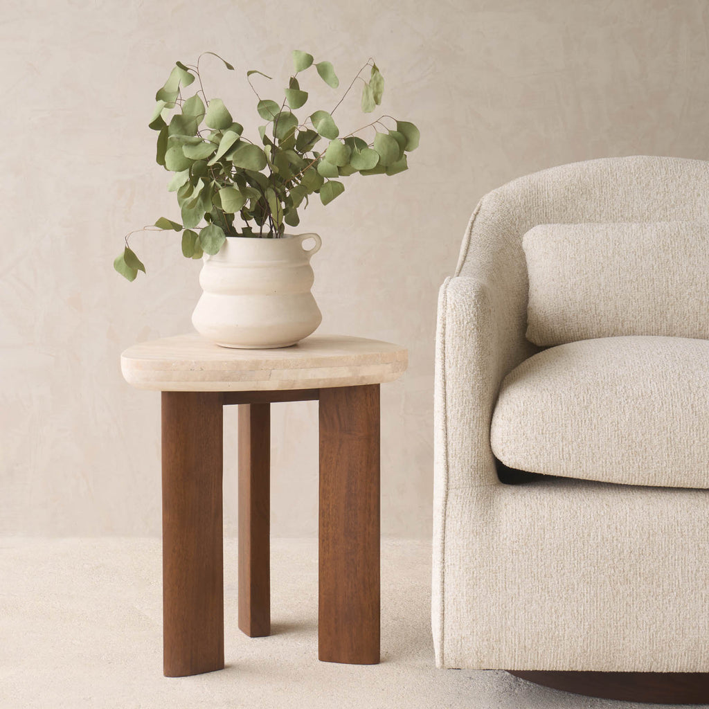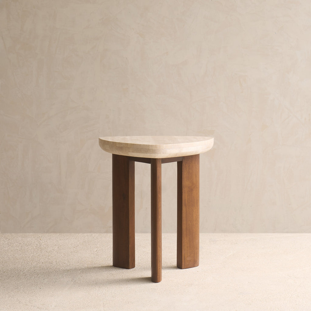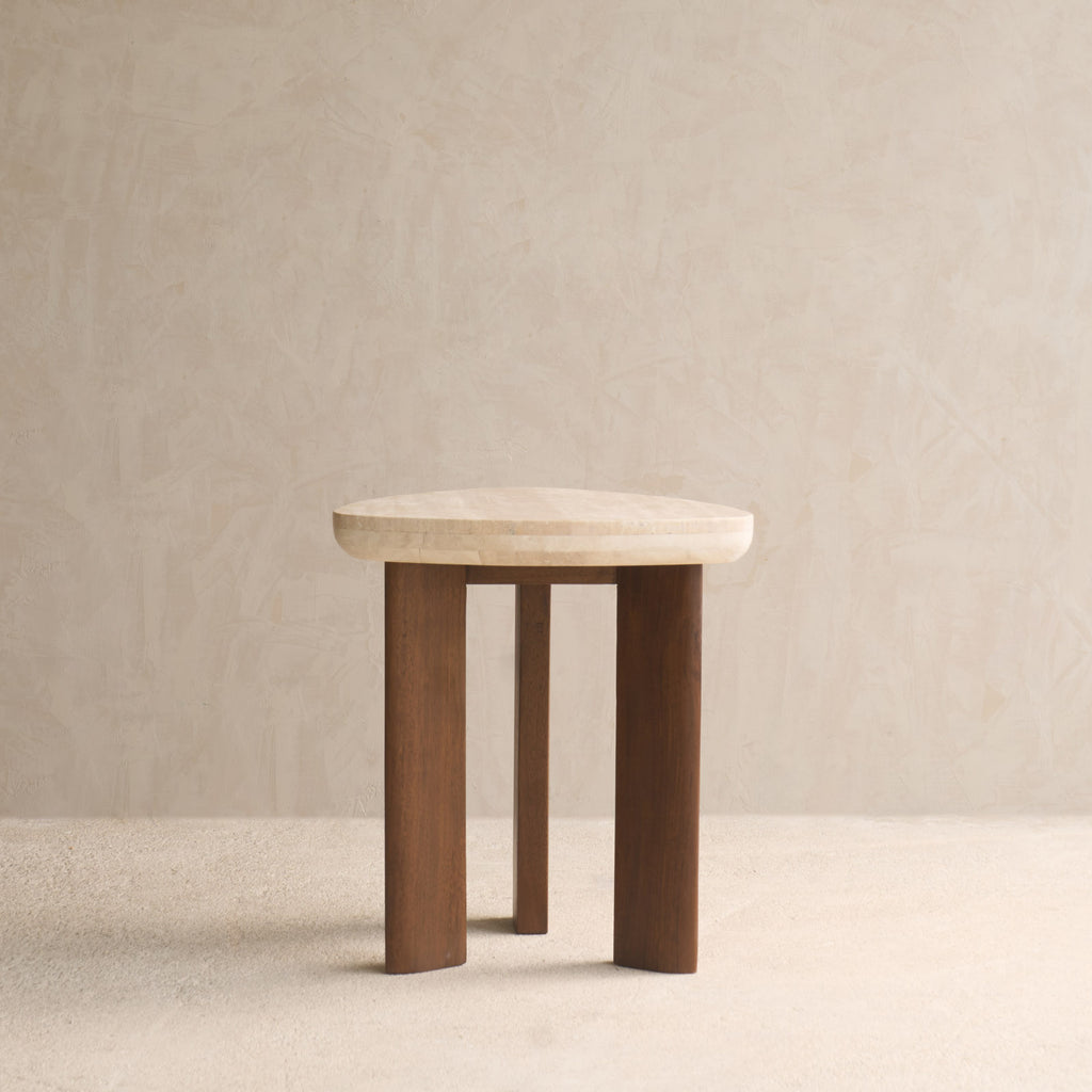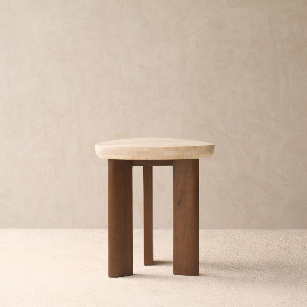 This elegant piece marries the natural beauty of travertine with the rich, warm tones of teak. Crafted from premium Travertine, known for its natural warmth and distinctive textures, it effortlessly captures attention with its inviting appeal and unique character. Base crafted from solid plantation teak. The Travertine top is sealed with a matt sealant to repel stains for easy maintenance. Flat-packed, assembled on delivery To protect the surface from heat and prevent marks and stains, always use a trivet or a coaster underneath hot plates, pans, or mugs. Use felt stoppers when you place decorative objects on the surface to prevent scratches or marks. Do not place sharp or jagged objects directly on the tabletop. Wipe spills or stains using a damp cloth and natural soap, follow with a clean damp cloth.