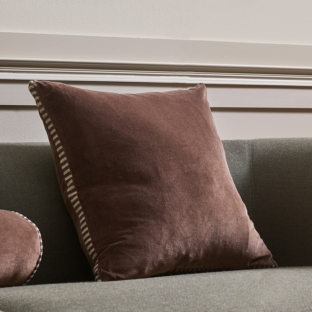 - Velvet front and back box cushion with printed stripe cotton/linen gusset.
