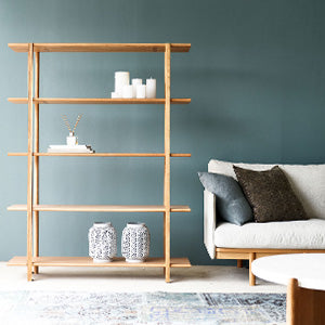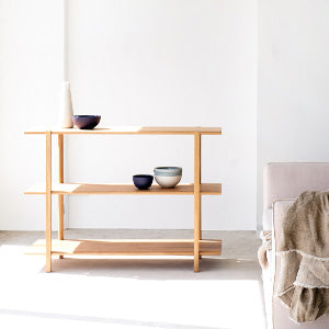 Strong yet visually light. The beauty of this architecture-inspired piece is in the repeating interlocking joints – a structure that does away with diagonal bracing in favour of clean horizontal and vertical lines. At each interval, the oak shelves appear to clasp the uprights effortlessly.