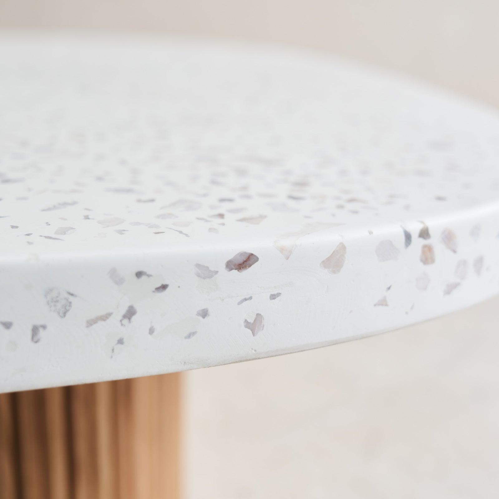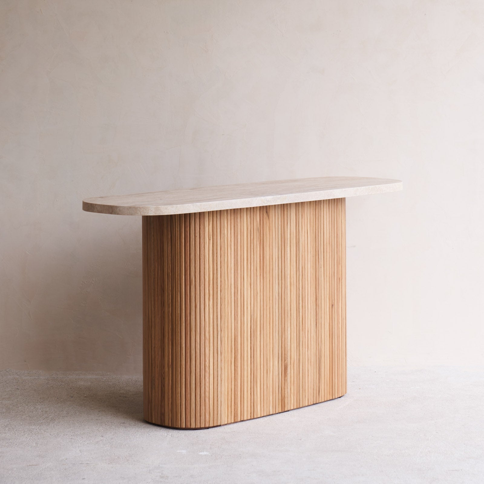 Base crafted from solid hardwood oak with ribbed wooden structure detail. Choose from premium Italian Travertine with its natural warmth and distinctive textures, or White Terrazzo, defined by its speckled patterns and timeless elegance. The protective clear matt sealant on our travertine and white terrazzo tops ensures lasting durability while preserving the natural beauty and texture of the surface. The clear satin lacquer finish is meticulously applied, providing a protective, smooth matte sheen that enhances the wood's natural beauty, highlighting its unique grain patterns. To protect the surface from heat and prevent marks and stains, always use a trivet or a coaster underneath hot plates, pans, or mugs. Use felt stoppers when you place decorative objects on the surface to prevent scratches or marks. Do not place sharp or jagged objects directly on the tabletop. Wipe spills or stains using a damp cloth and natural soap, follow with a clean damp cloth.