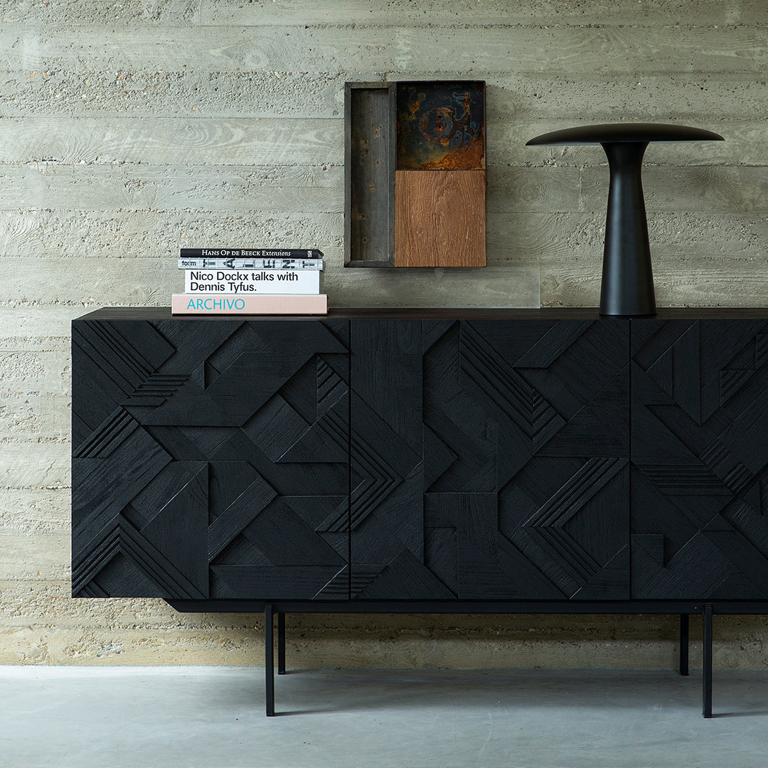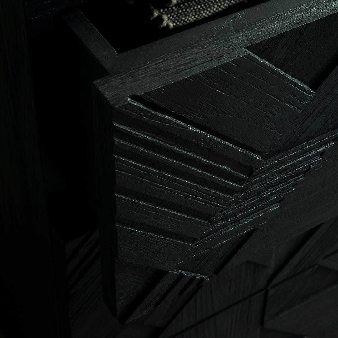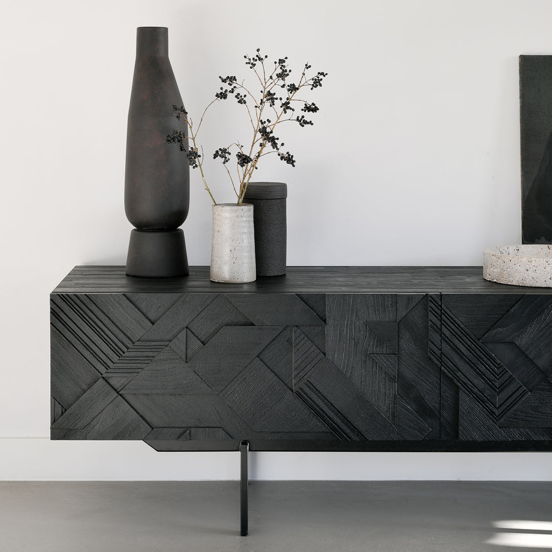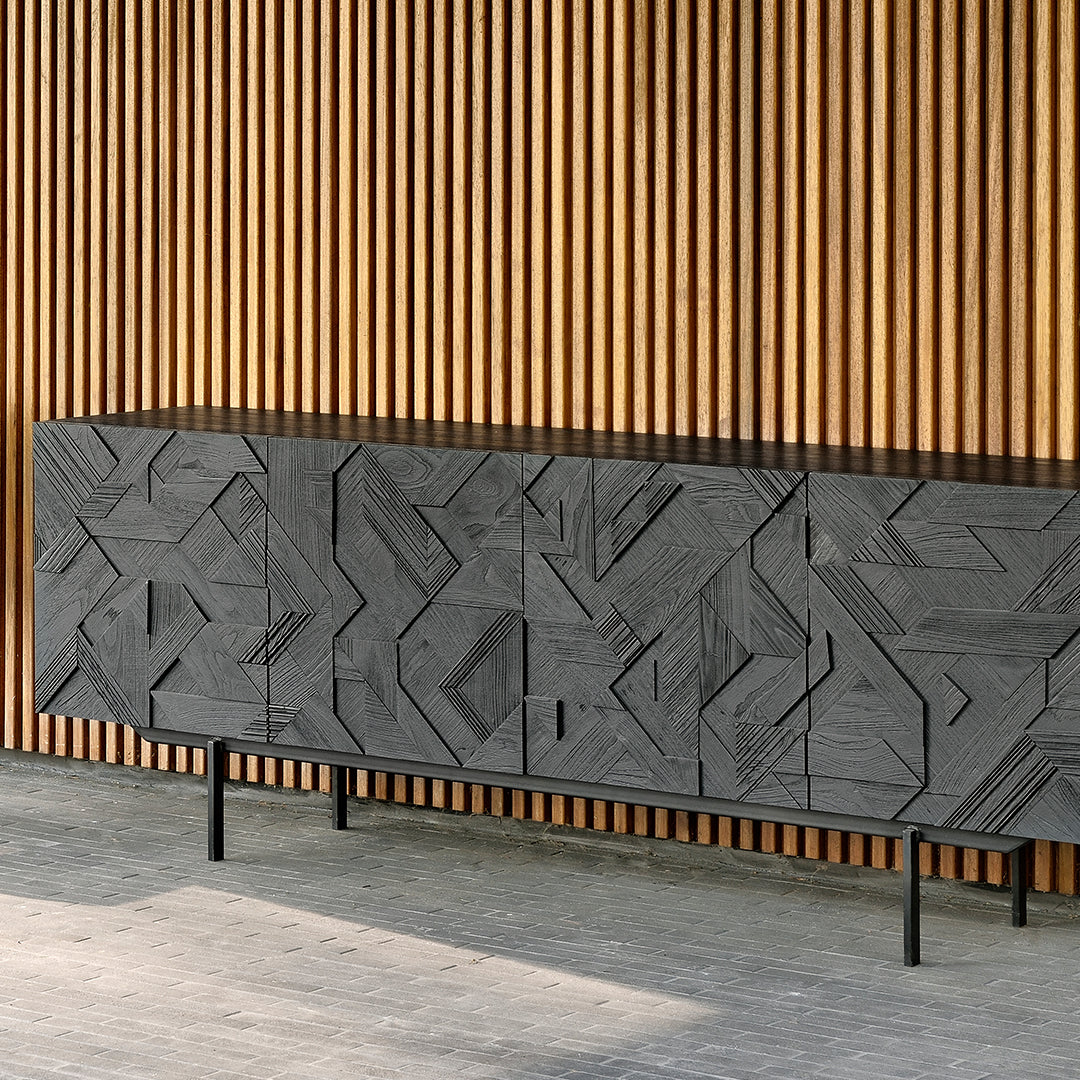 The Graphic TV Console from Ethnicraft is the perfect way to add a creative accent to your living areas. Features a striking triangular pattern designed by Alain van Havre, creating a layered, three-dimensional effect. Crafted from black-tainted solid FSC-certified teak wood. The teak varnish finish is carefully applied, offering a protective, smooth matte sheen that enhances the natural beauty of the teak wood, bringing out its rich, unique grain patterns. Wipe timber to remove dust and dirt with a dry cloth. Wipe spills immediately using a damp cloth and natural soap, ensure you wipe the surface along the grain of wood.