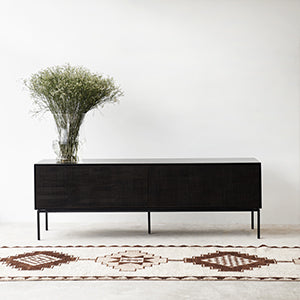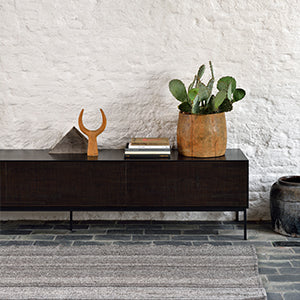 The Grooves sideboard from Ethnicraft is soulful to say the least. Features hand-carved grooves, with each line meticulously crafted, giving the table a unique, artistic touch. Crafted from black-tainted solid FSC-certified teak wood. The teak varnish finish is carefully applied, offering a protective, smooth matte sheen that enhances the natural beauty of the teak wood, bringing out its rich, unique grain patterns. Wipe timber to remove dust and dirt with a dry cloth. Wipe spills immediately using a damp cloth and natural soap, ensure you wipe the surface along the grain of wood.