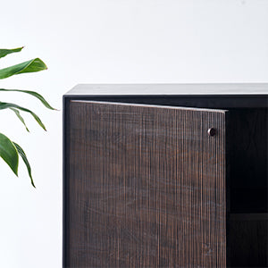 As a result, every surface has its own distinct rhythm and dynamics. The rich dark-tinted teak extends to the interior, where shelves are perfect for displaying your most treasured items.