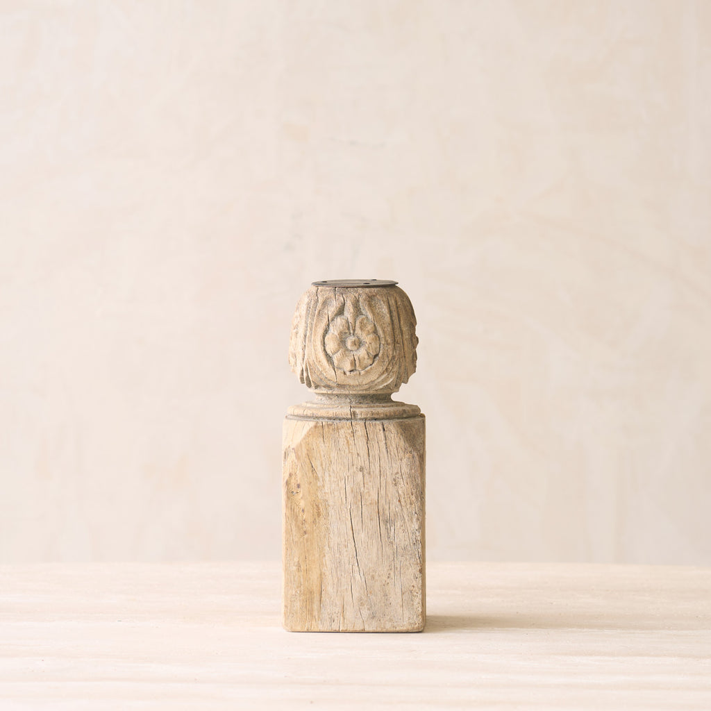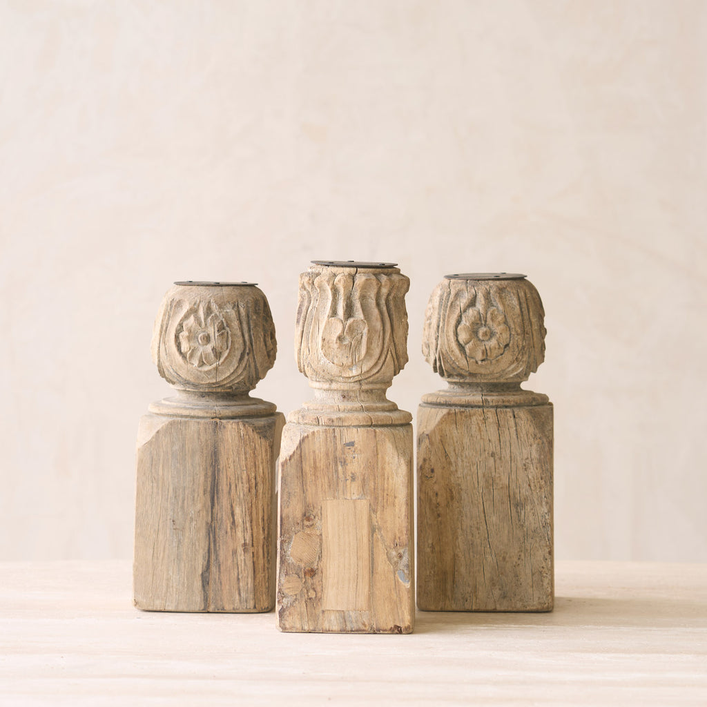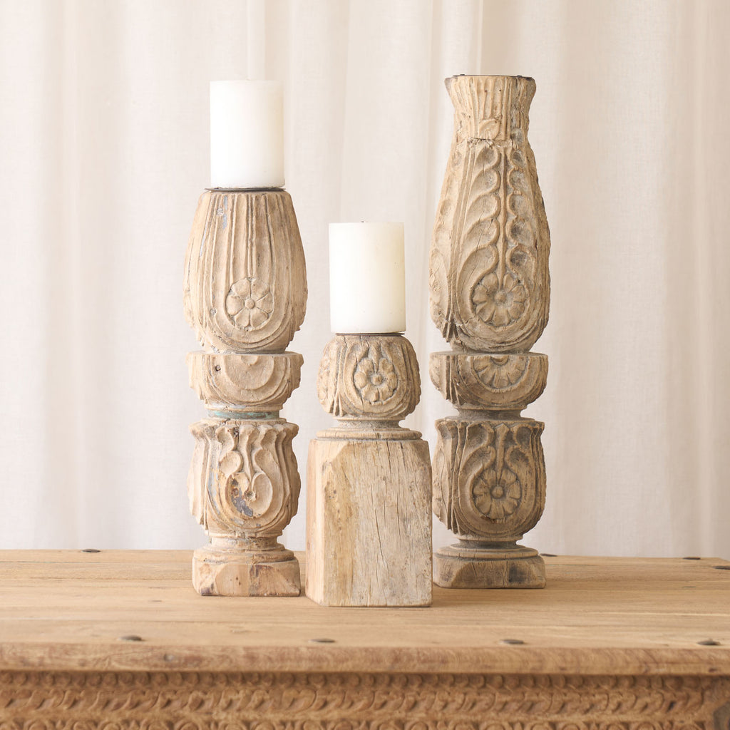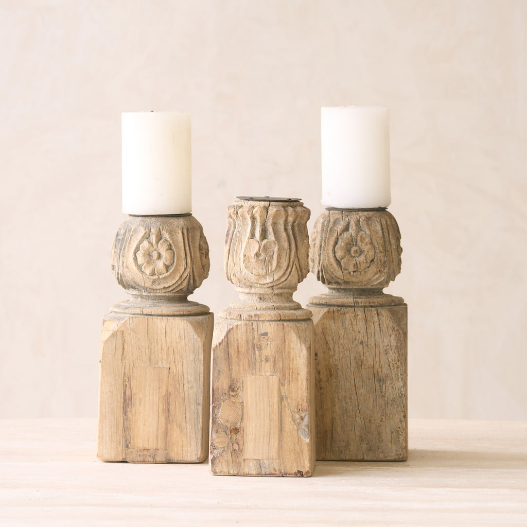 These vintage wooden candle stands originate from Rajasthan, India. They showcase an exquisite and antique design. The candle holders are ingeniously crafted with a metal base featuring a central spike, ensuring steadfast stability for an array of candle types. Embrace the essence of history blended with modern allure as you adorn your space with these distinctive Indian candle stands.