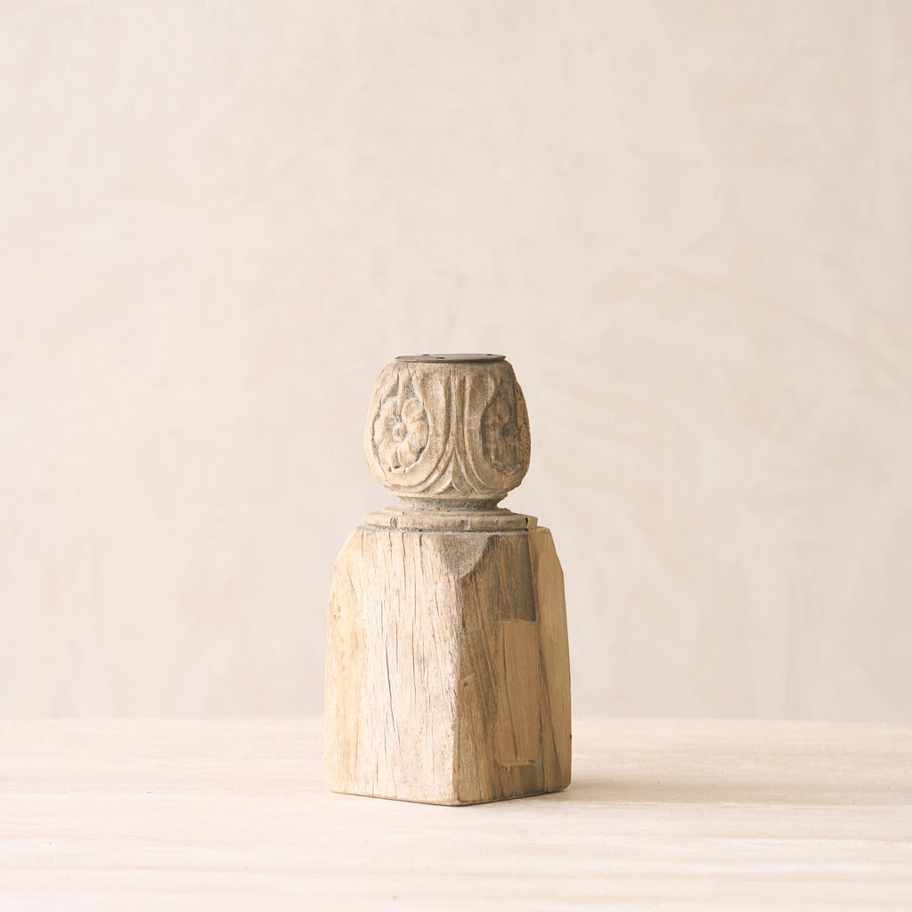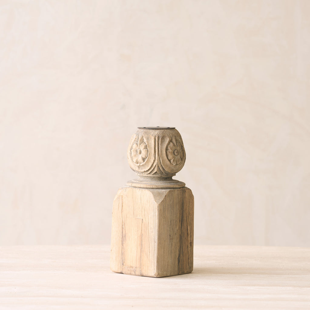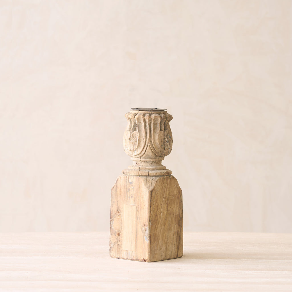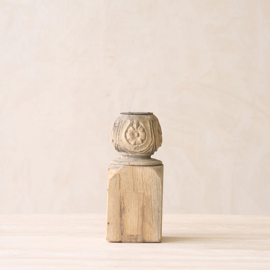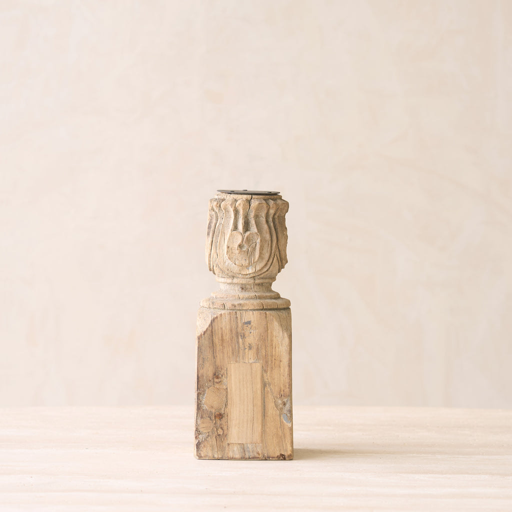 These vintage wooden candle stands originate from Rajasthan, India. They showcase an exquisite and antique design. The candle holders are ingeniously crafted with a metal base featuring a central spike, ensuring steadfast stability for an array of candle types. Embrace the essence of history blended with modern allure as you adorn your space with these distinctive Indian candle stands.