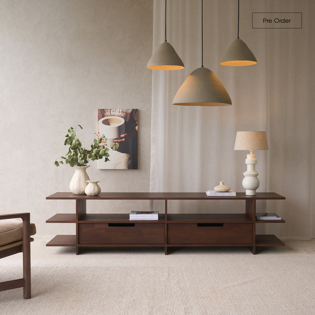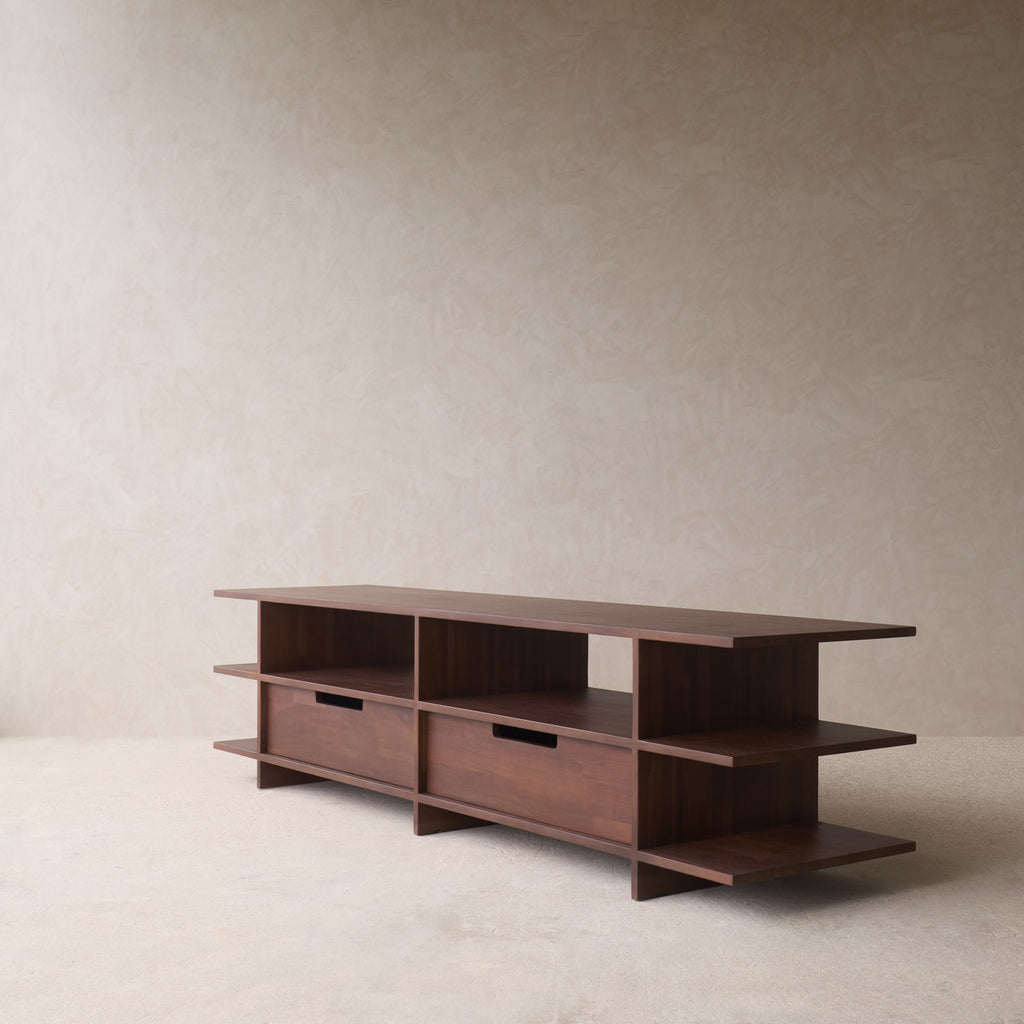 The Kabuki TV Console blends balance and symmetry with refined elegance. Crafted from solid, FSC-certified sustainably sourced teak from Indonesia. Varnished finish for enhanced durability and protection, highlighting the natural beauty of the wood. Regular wiping with lint-free cotton cloth or sponge in warm water with mild dishwashing soap solution to remove food and oil stains. Fine grit sand paper can be used to remove any surface scratches. Avoid strong and abrasive cleaning products that may cause permanent damage to the wood.
