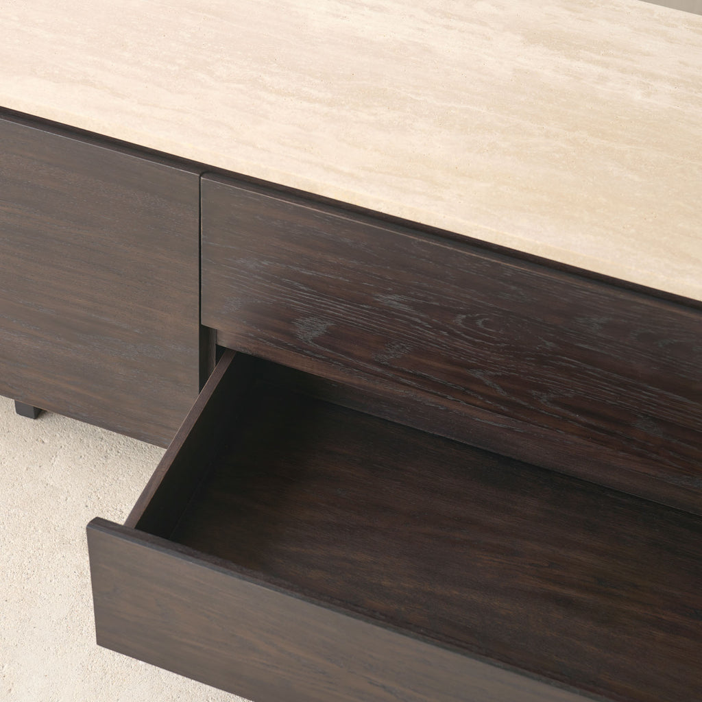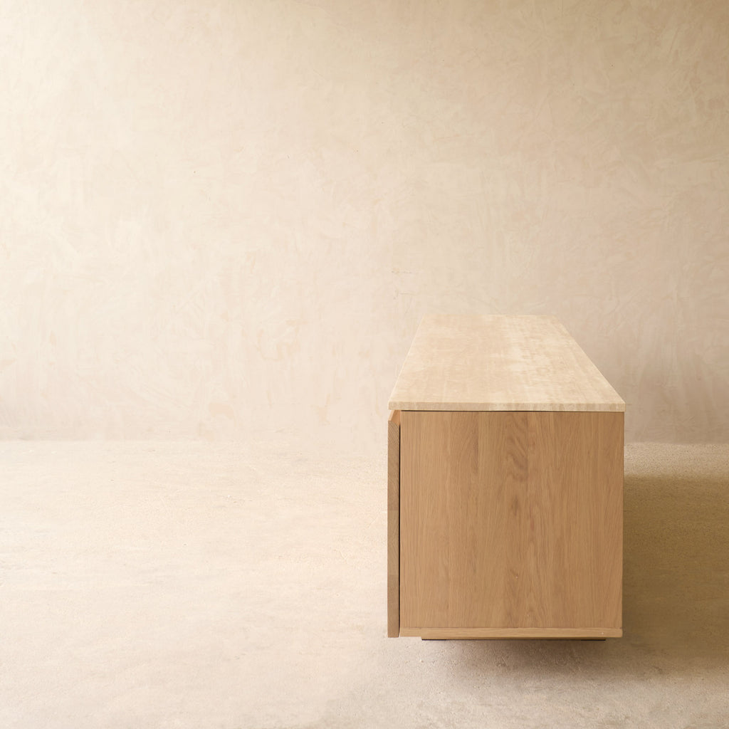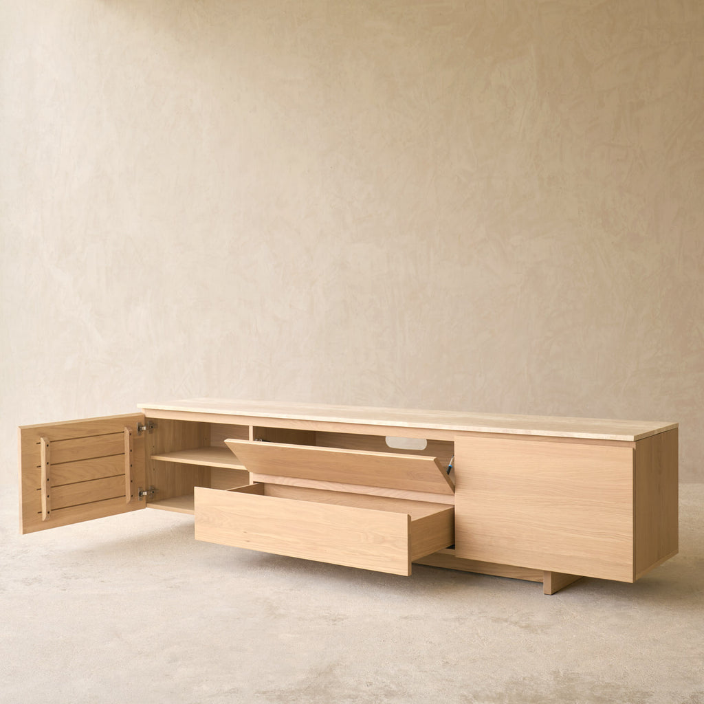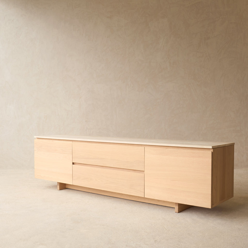 The Kami TV Console embodies strength and functionality. Crafted with thick planks in a minimalist, unembellished design, they offer generous storage within a clean, streamlined form. A sturdy timber plinth base provides stability, while the top panel is available in solid oak or natural stone for a refined touch.