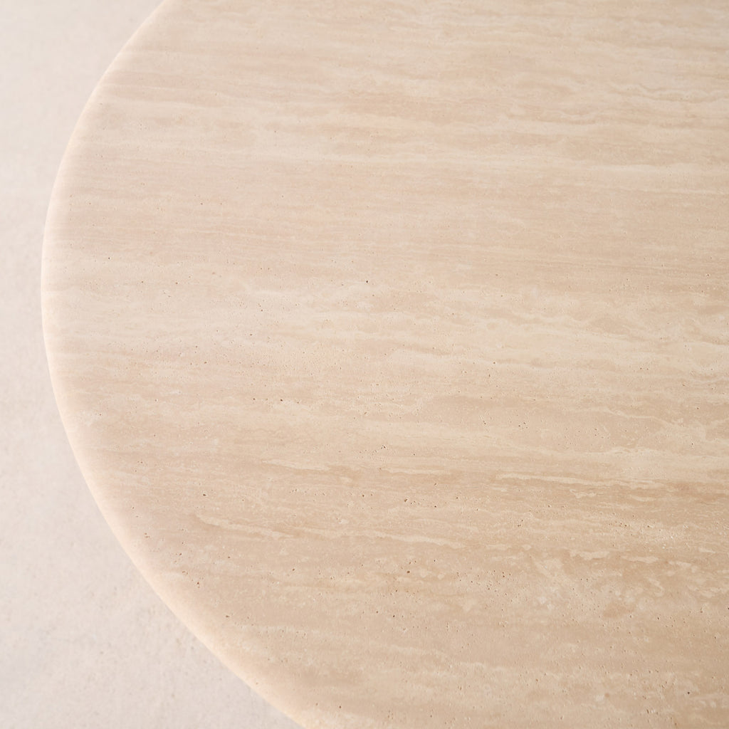 The base is meticulously crafted from solid American walnut or solid oak timber, with no use of veneers or engineered wood in the construction. Choose from premium Italian Travertine with its natural warmth and distinctive textures, or Bianco Carrara Marble, renowned for its pristine white colour and luxurious appeal. The clear satin lacquer finish is meticulously applied, providing a protective, smooth matte sheen that enhances the wood's natural beauty, highlighting its unique grain patterns. The protective clear matt sealant on our travertine and marble tops ensures lasting durability while preserving the natural beauty and texture of the surface. To protect the surface from heat and prevent marks and stains, always use a trivet or a coaster underneath hot plates, pans, or mugs. Use felt stoppers when you place decorative objects on the surface to prevent scratches or marks. Do not place sharp or jagged objects directly on the tabletop.