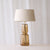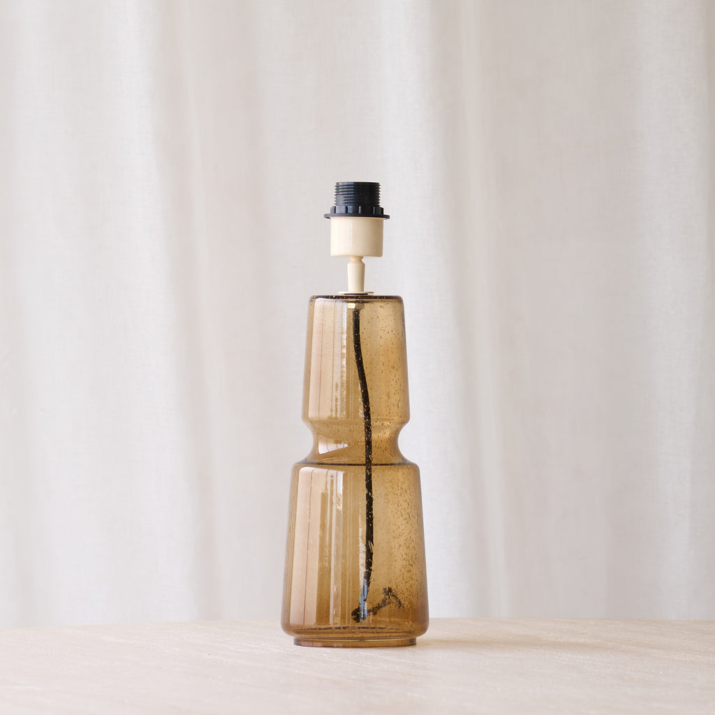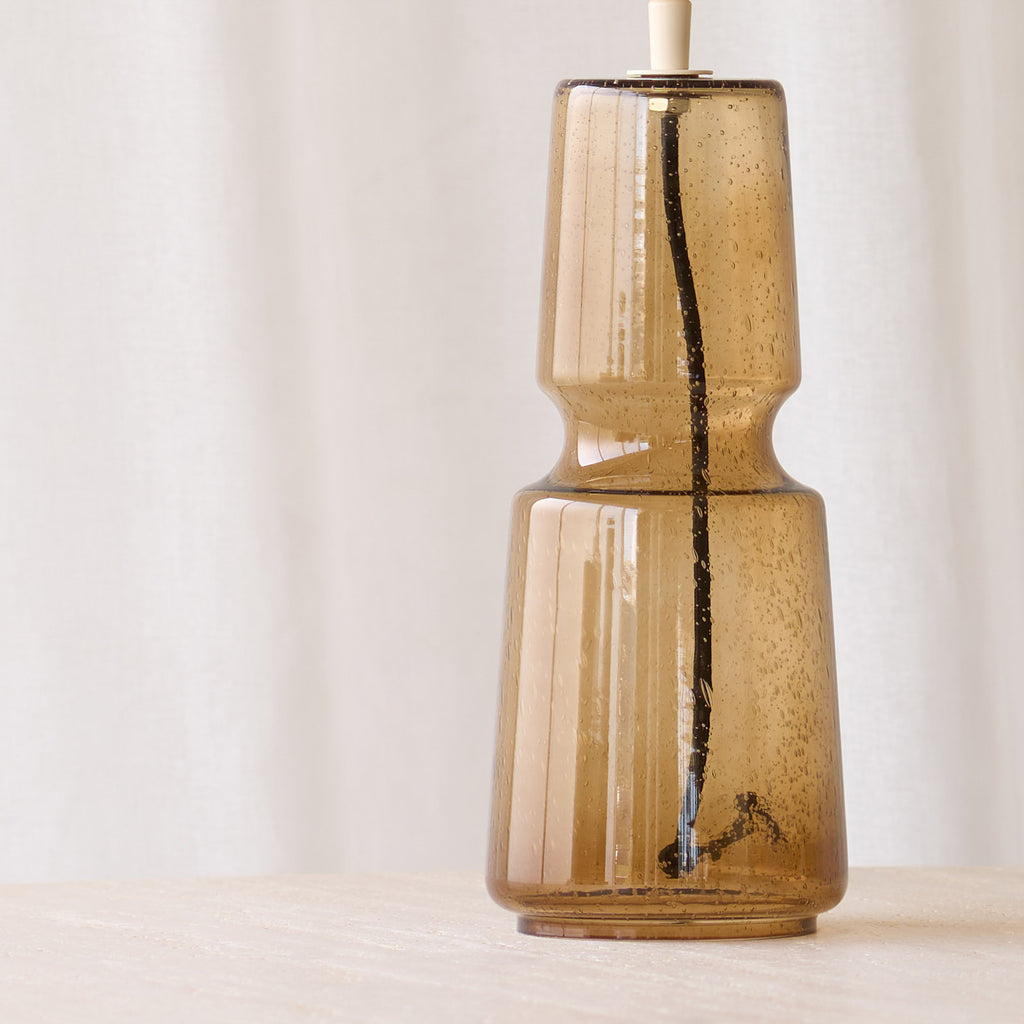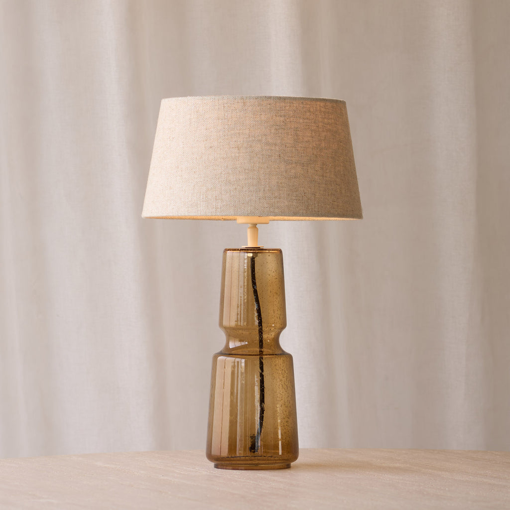 The Labin Table Lamp features a smoked glass base with black accents, combining modern sophistication and subtle charm for a striking statement piece.