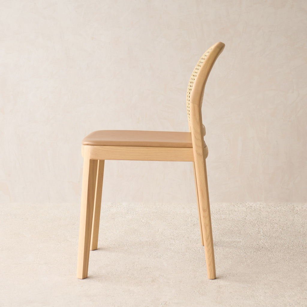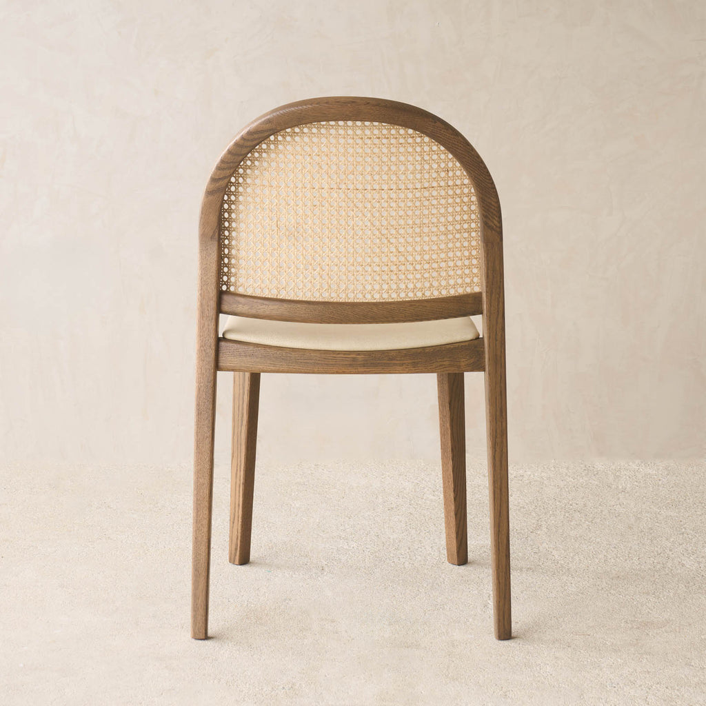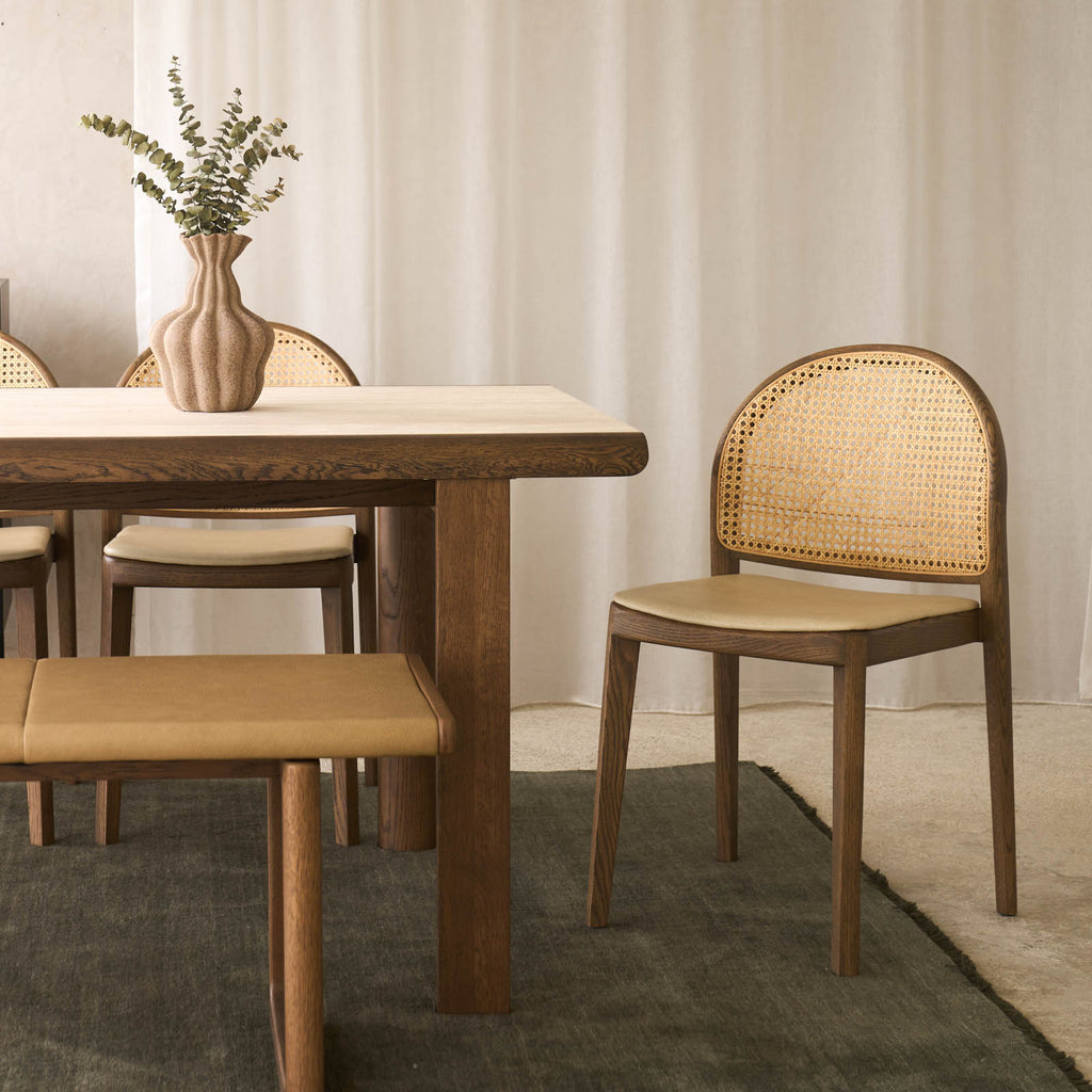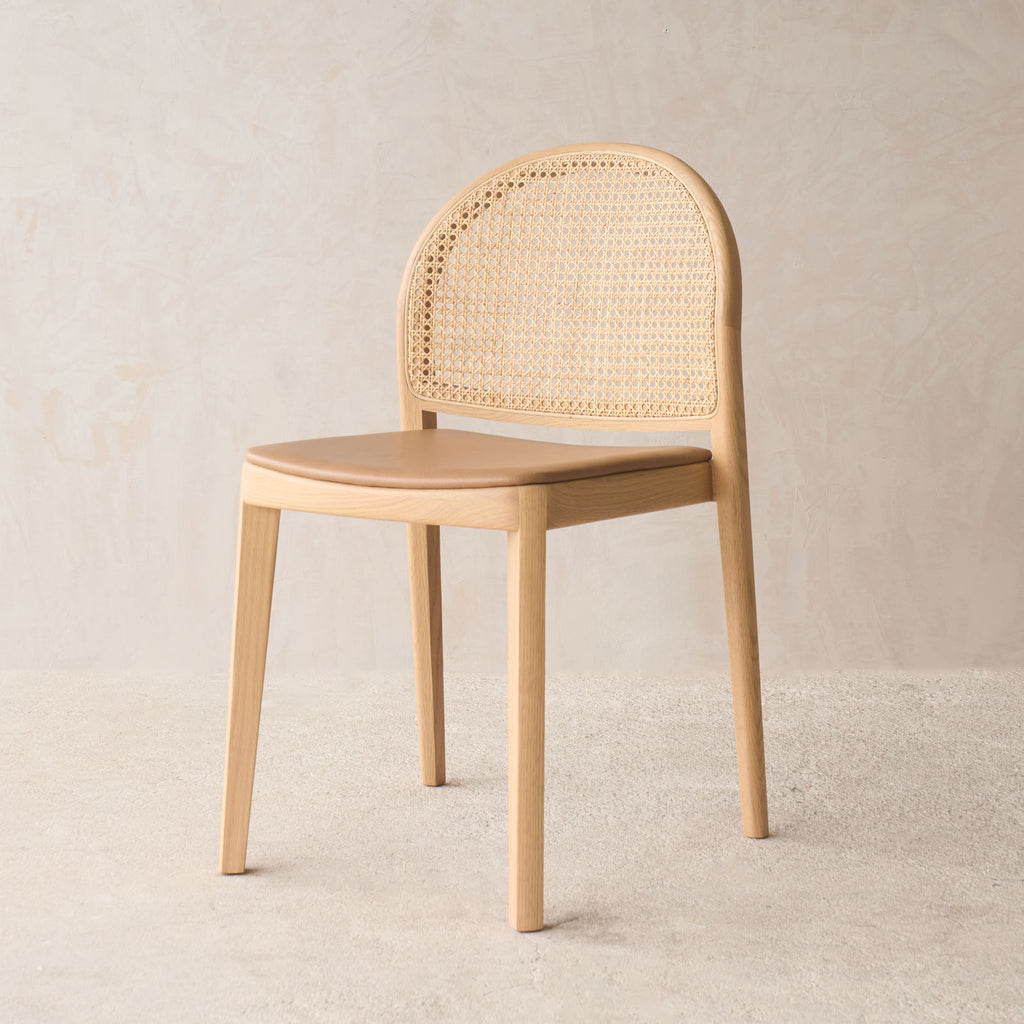 Defined by its distinctive arched silhouette, the Luk Dining Chair brings a refined sense of lightness to any space. Crafted from solid oak with a handwoven natural rattan seat and backrest, celebrating the warmth and texture of natural materials. Features soft, flowing lines and thoughtful detailing that highlight the grain of the wood and the beauty of cane weave. Designed with comfort and practicality in mind — neatly stackable and easy to move when needed. Wipe rattan gently with a dry or slightly damp cloth to remove dust and dirt. Avoid excessive moisture and direct sunlight to preserve the integrity of the natural cane and timber. Clean wooden surfaces with a soft, dry cloth; avoid harsh cleaners or solvents.