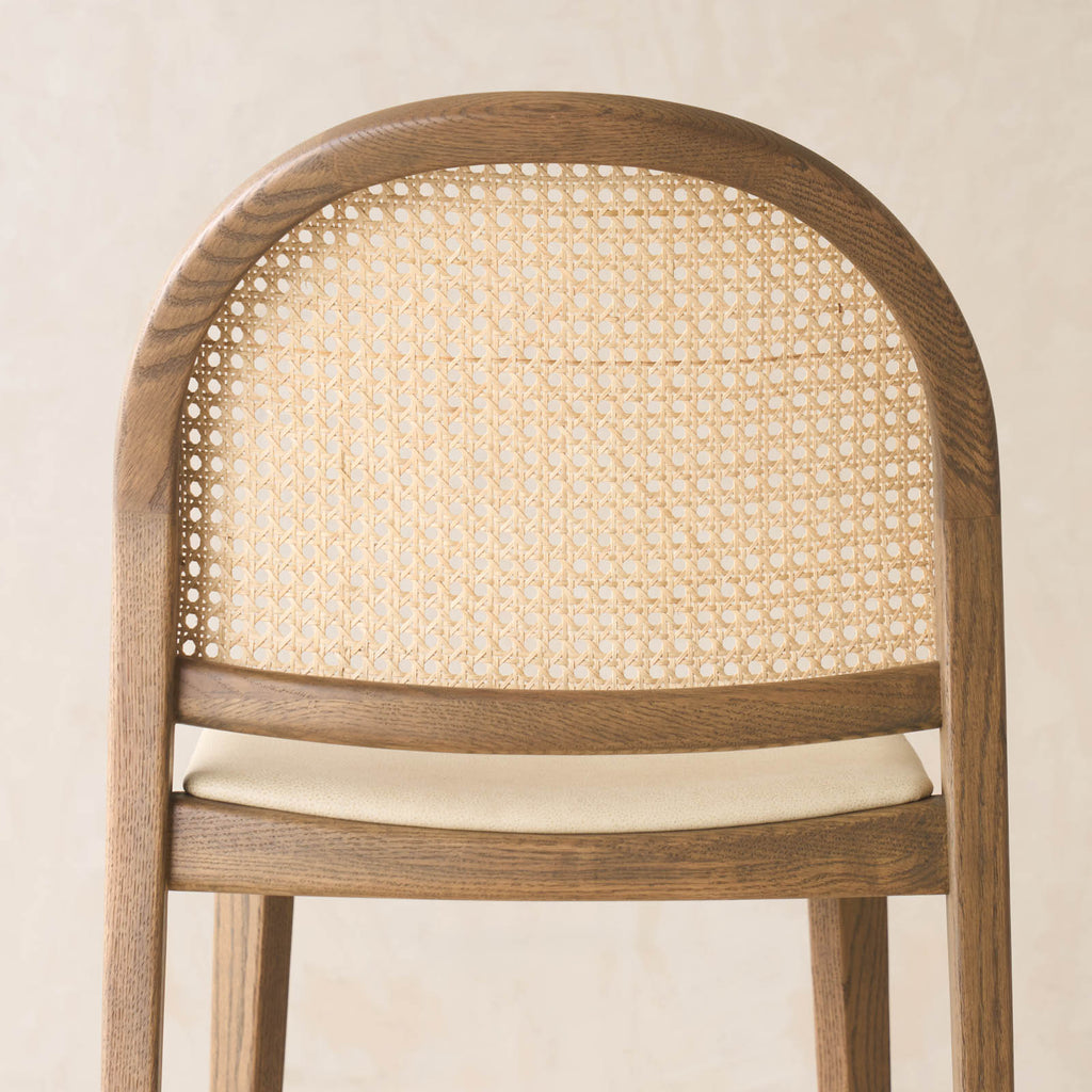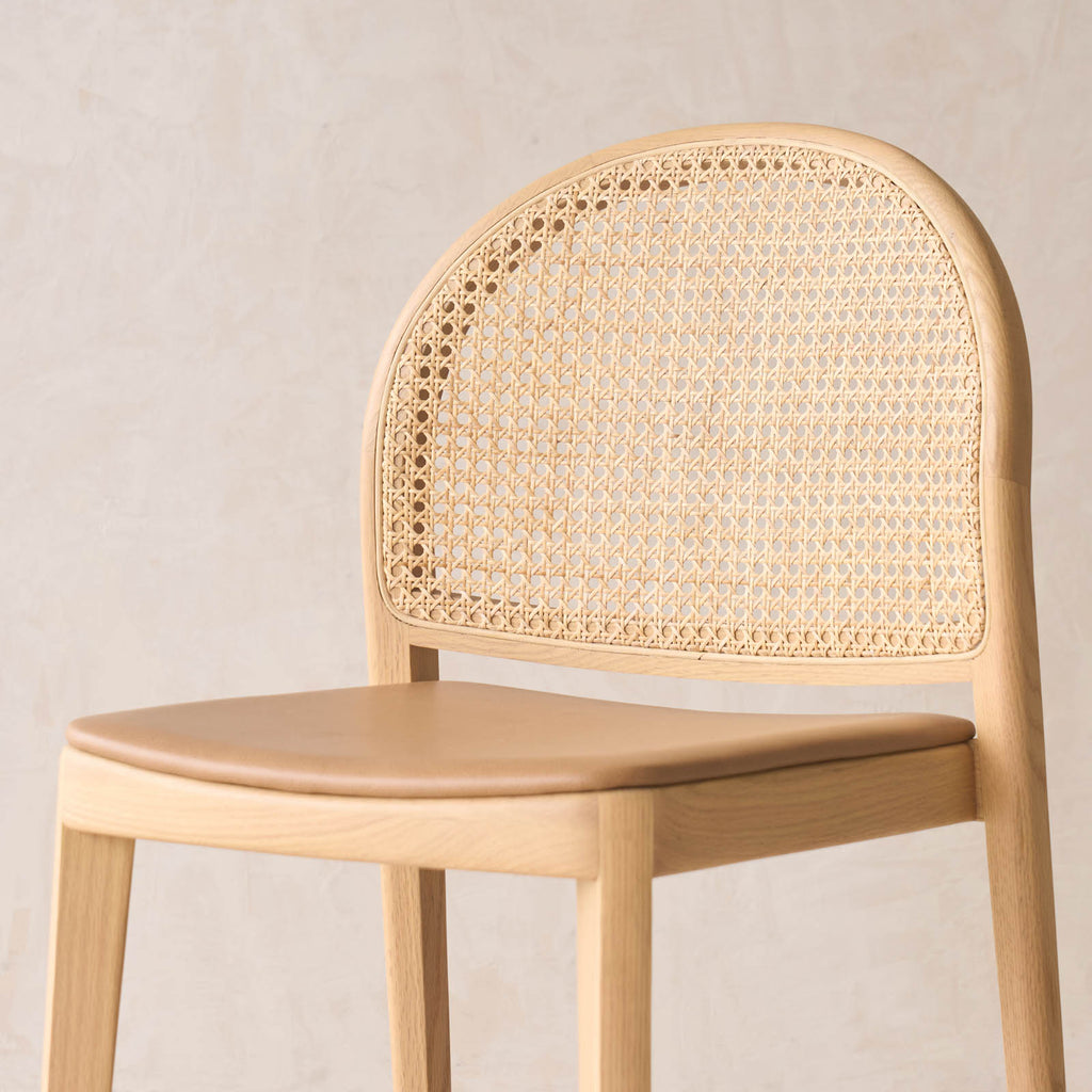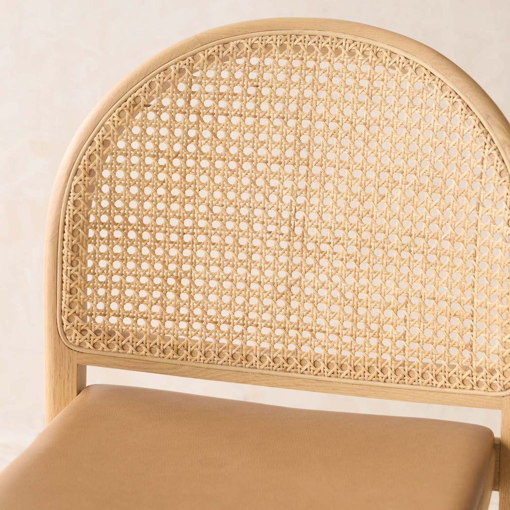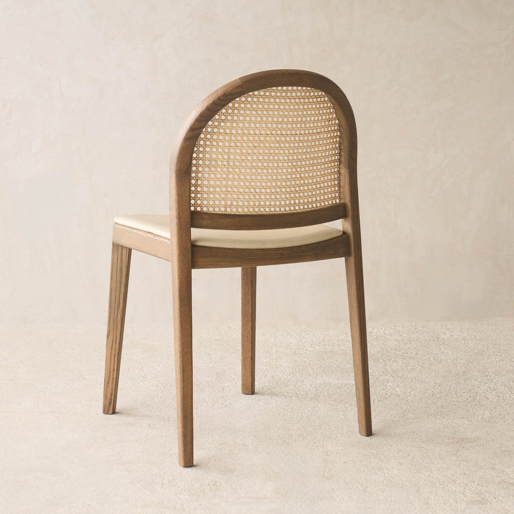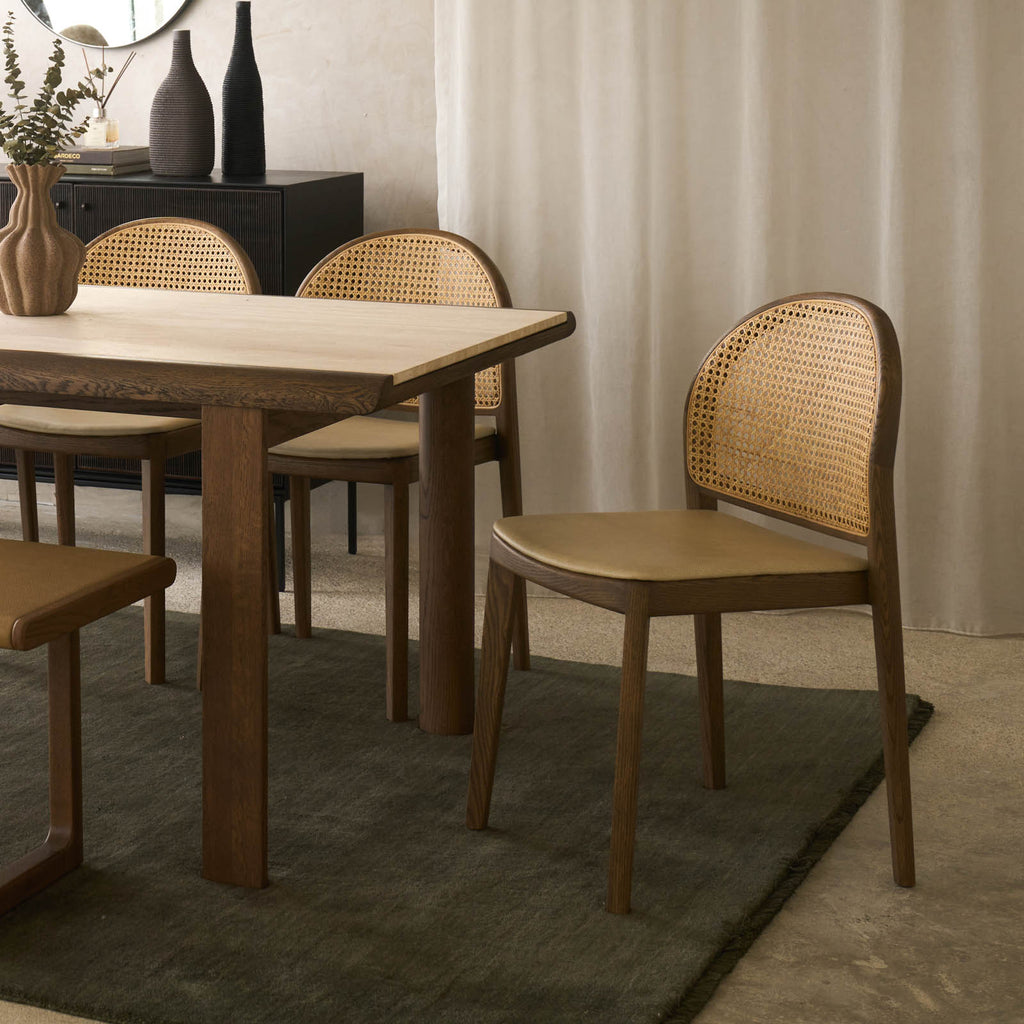 Defined by its distinctive arched silhouette, the Luk Dining Chair brings a refined sense of lightness to any space. Crafted from solid oak with a handwoven natural rattan seat and backrest, celebrating the warmth and texture of natural materials. Features soft, flowing lines and thoughtful detailing that highlight the grain of the wood and the beauty of cane weave. Designed with comfort and practicality in mind — neatly stackable and easy to move when needed. Wipe rattan gently with a dry or slightly damp cloth to remove dust and dirt. Avoid excessive moisture and direct sunlight to preserve the integrity of the natural cane and timber. Clean wooden surfaces with a soft, dry cloth; avoid harsh cleaners or solvents.