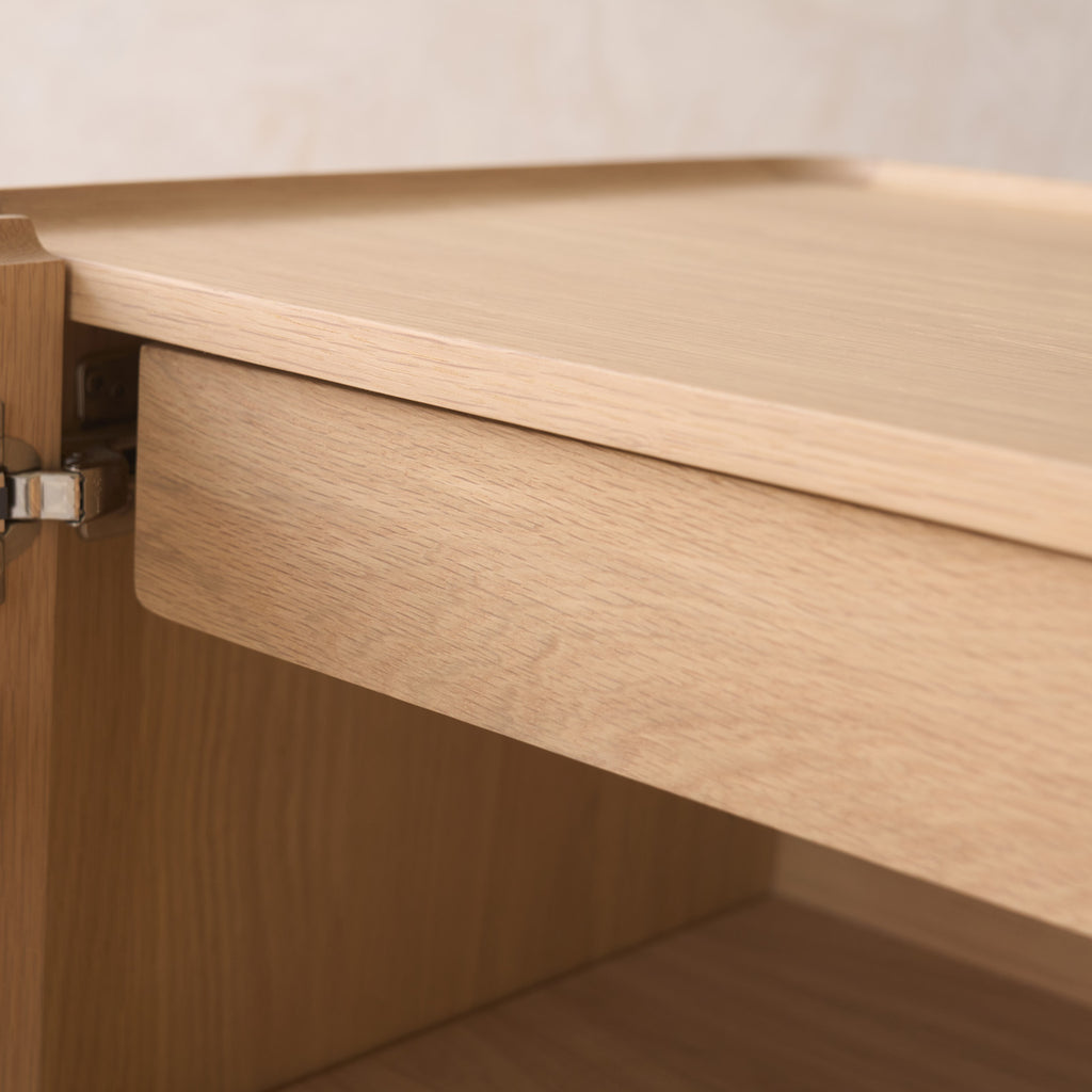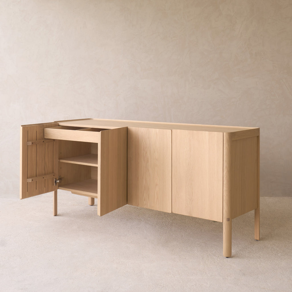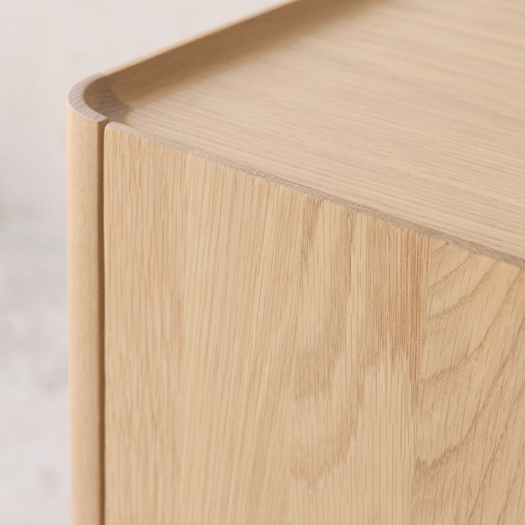 Optimise your living room with the Nell Oak Sideboard. A masterpiece of modern design that seamlessly blends harmonious elements to elevate your living space. Crafted to captivate both the eye and touch, every detail of this sideboard demands attention. Its distinctive scalloped top shelf not only offers a secure surface but also adds a touch of elegance. The sideboard is a true tribute to the artistry of timber craftsmanship and enduring architectural shapes, making it a timeless addition to your home.