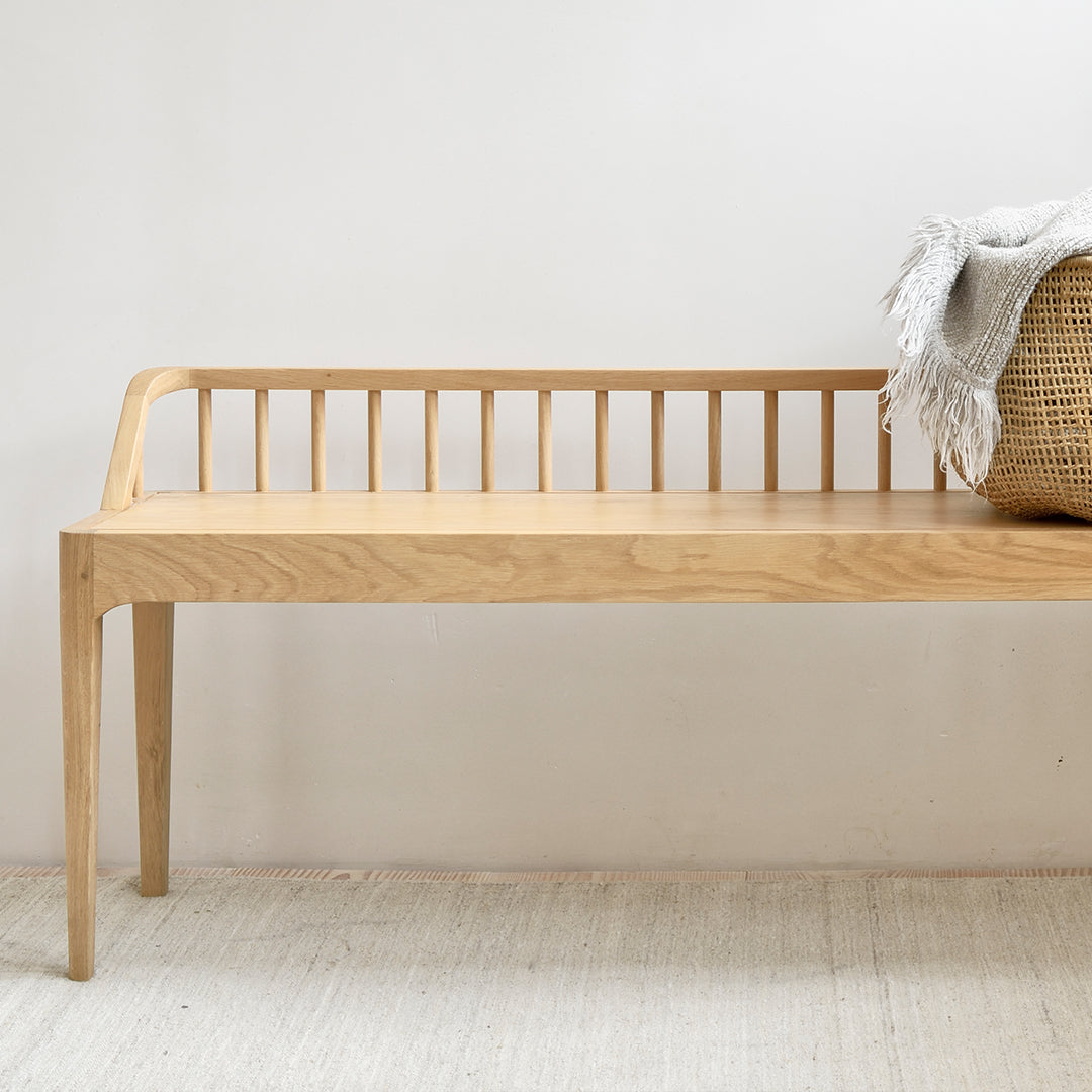 The Spindle collection found its inspiration in the traditional spinning wheel and incorporates perfectly aligned spokes into the backseat. Wherever you choose to place it, the Spindle bench in black solid oak is a striking piece.