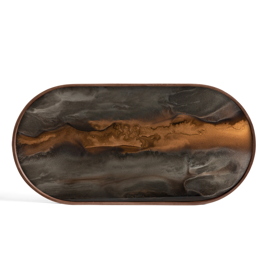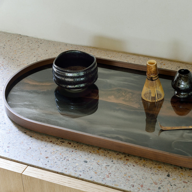 The Organic Valet Tray by Dawn Sweitzer for Ethnicraft blends art and function, featuring nature-inspired organic shapes, rich colours, and luxurious gold-leaf details within a sleek border. Its refined design makes it an elegant addition to any space.