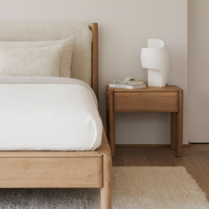 The PI Bedside Table in Oak celebrates the natural beauty of solid wood with its organic curves and smooth, hand-finished surface. With a discreet drawer and softly elevated profile, it is a versatile piece that blends seamlessly into any space, bringing warmth, balance and effortless style to your bedroom.