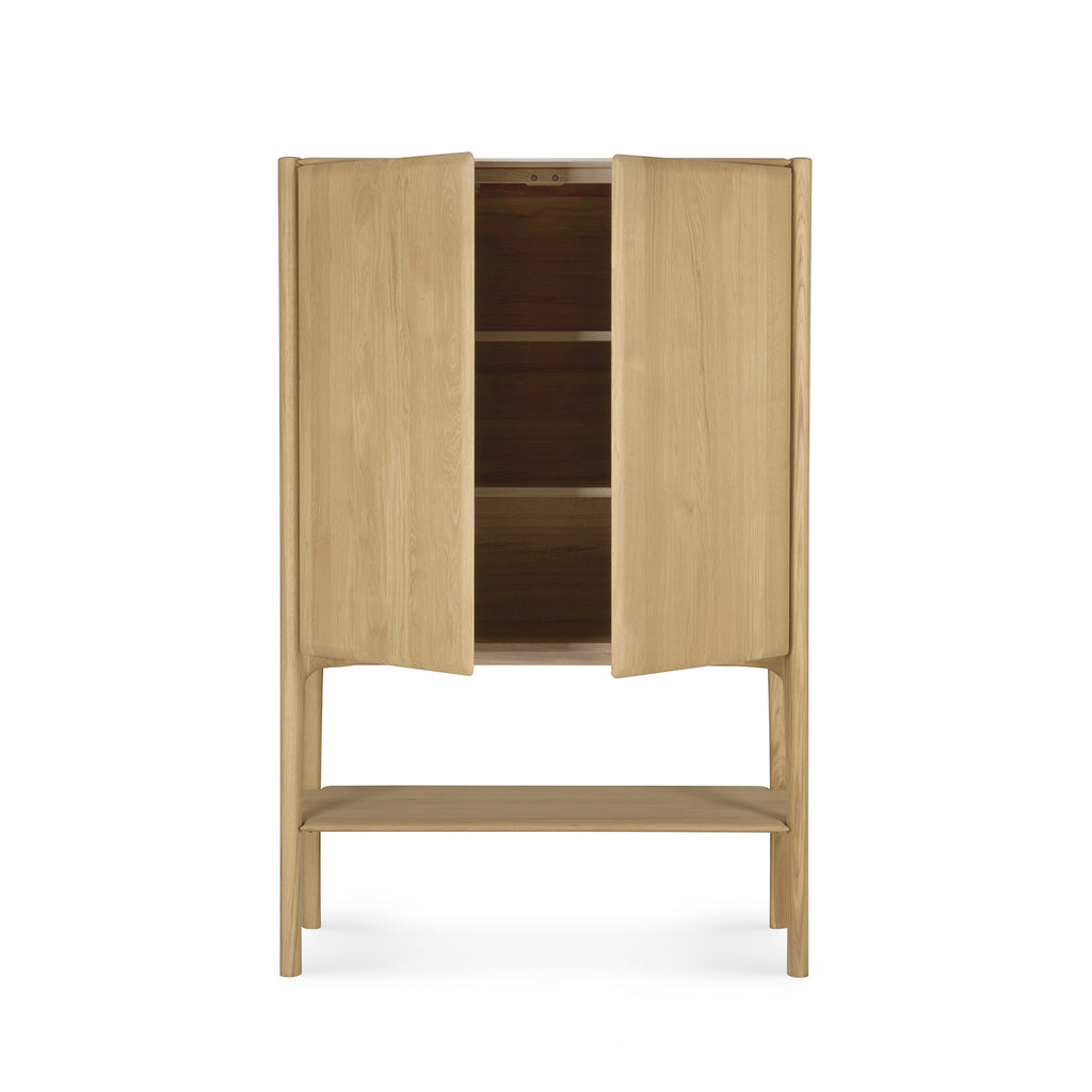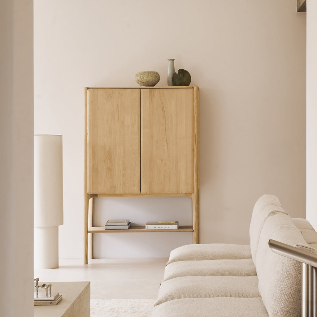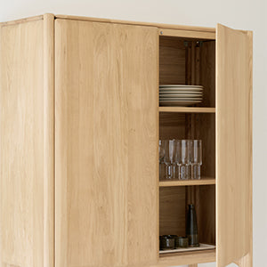 The Oak PI Cupboard retains the clean, minimalist aesthetic of the PI collection, with elegant curves and natural imperfections. Crafted from solid hardwood oak timber. Solid wood only, no veneers or engineered wood used in this piece. The clear satin lacquer finish is meticulously applied, providing a protective, smooth matte sheen that enhances the wood's natural beauty, highlighting its unique grain patterns. For regular care, wipe the surface with a dry (lint-free) cloth. For oil and food stains use a damp cloth to wipe stains and follow with a clean dry cloth. Do not leave liquid to sit on timber surface as it will penetrate and may cause staining.
