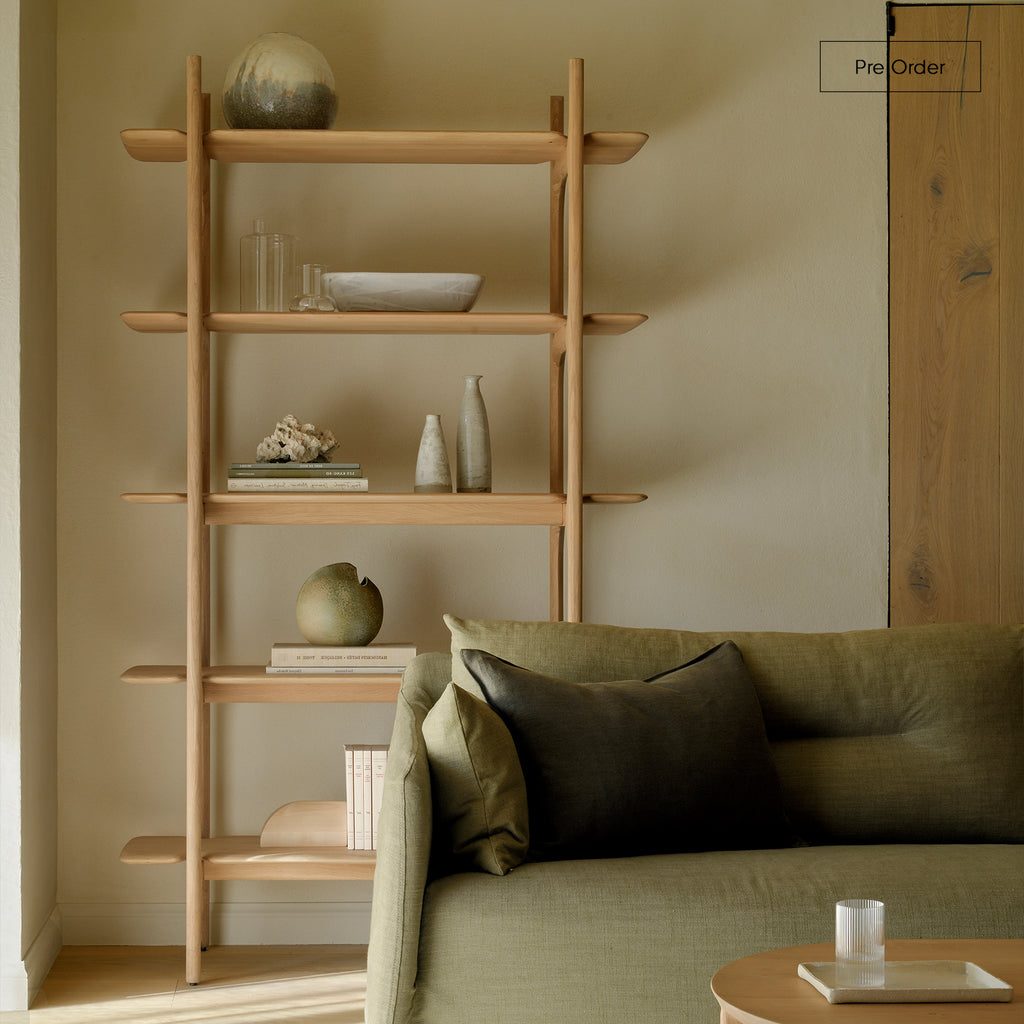 The PI Rack celebrates nature’s organic design with its natural curves and strong lines, preserving the unique beauty of the wood. Crafted from solid hardwood oak timber. Solid wood only, no veneers or engineered wood used in this piece. With its sleek, stylish form, the PI Rack offers a refined space to display your most treasured items, combining functionality with nature-inspired elegance. The clear satin lacquer finish is meticulously applied, providing a protective, smooth matte sheen that enhances the wood's natural beauty, highlighting its unique grain patterns. For regular care, wipe the surface with a dry (lint-free) cloth.