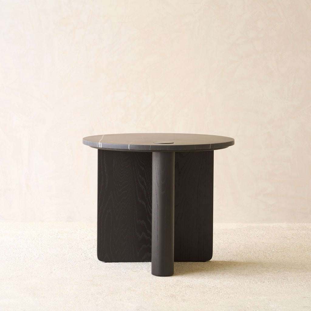 Mirroring the large cylindrical leg, a half-length timber dowel at the table’s end completes the design, adding symmetry and reinforcing the collection's harmonious blend of form and function.