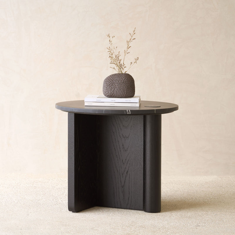 Our Pivot side table is a perfect addition to any living space, this side table features a solid wood dowel which meets a t-frame, providing contrast between the cylindrical and flat surfaces. Crafted from solid hardwood oak. The Travertine top is sealed with a matt sealant to repel stains for easy maintenance. The matt sealant finish is meticulously applied, providing a protective, smooth matte sheen that enhances the wood's natural beauty, highlighting its unique grain patterns. To protect the surface from heat and prevent marks and stains, always use a trivet or a coaster underneath hot plates, pans, or mugs. Use felt stoppers when you place decorative objects on the surface to prevent scratches or marks. Do not place sharp or jagged objects directly on the tabletop. Wipe spills or stains using a damp cloth and natural soap, follow with a clean damp cloth.