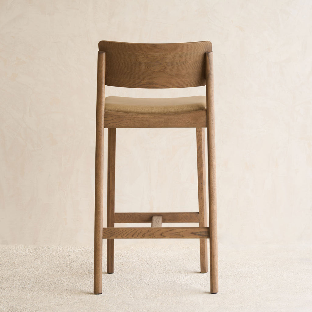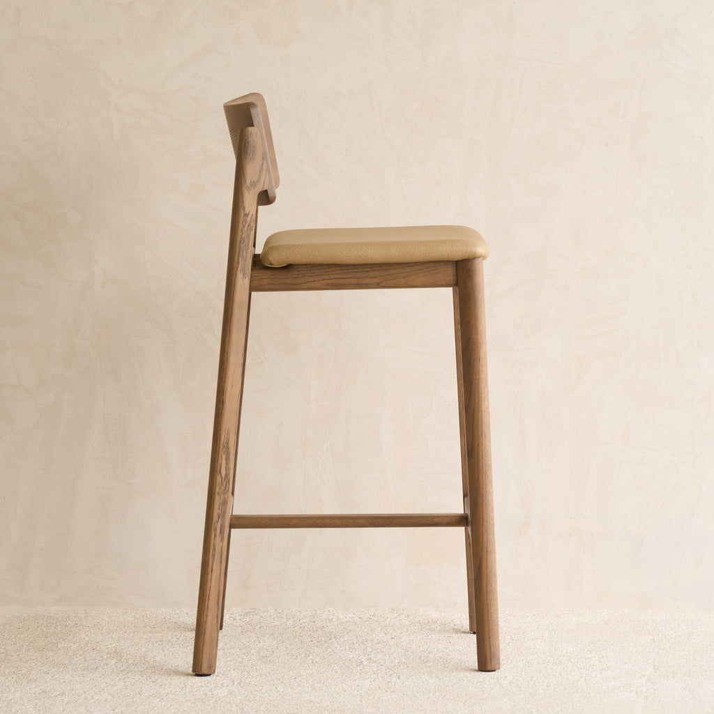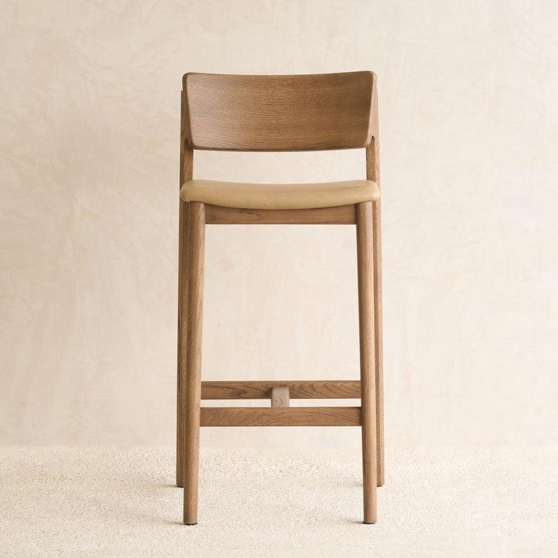 Designed for durability, the Poise Counter Stool is crafted with a solid oak timber frame and upholstered seat and backrest. Gently contoured seat and backrest for comfortable counter-height seating. Spot clean for any small stain or marks. Wipe timber with a clean dry lint-free cloth. Do not use harsh leather polishes or cleaner as it may damage the finish of the leather.