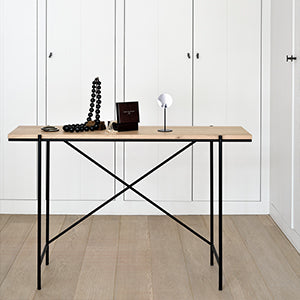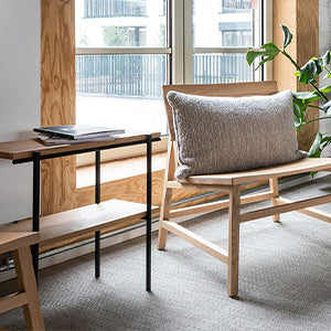 A light rectangular design inspired by minimalistic residential architecture is formed by the warmth of oak and powder coated metal base. Its sleek frame is sturdy and reliable, holding up dual table tops which allow extra capacity to hold or display your favourite homewares and accessories. Crafted from solid hardwood oak. The clear satin lacquer finish is meticulously applied, providing a protective, smooth matte sheen that enhances the wood's natural beauty, highlighting its unique grain patterns. Features a coating of black powder on its metal surface, providing a durable and sleek finish. For regular care, wipe the surface with a dry (lint-free) cloth. For oil and food stains use a damp cloth to wipe stains and follow with a clean dry cloth. Do not leave liquid to sit on timber surface as it will penetrate and may cause staining.