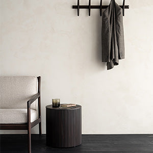 Its unique stacked wood-stick design allows for convenient removal of the tabletop, providing a discreet solution to stow away everyday items. This side table is crafted from sustainably sourced timber with a varnish finish. Dark brown stained solid mahogany wood. For regular care, wipe the surface with a dry (lint-free) cloth. For oil and food stains use a damp cloth to wipe stains and follow with a clean dry cloth. Do not leave liquid to sit on timber surface as it will penetrate and may cause staining.