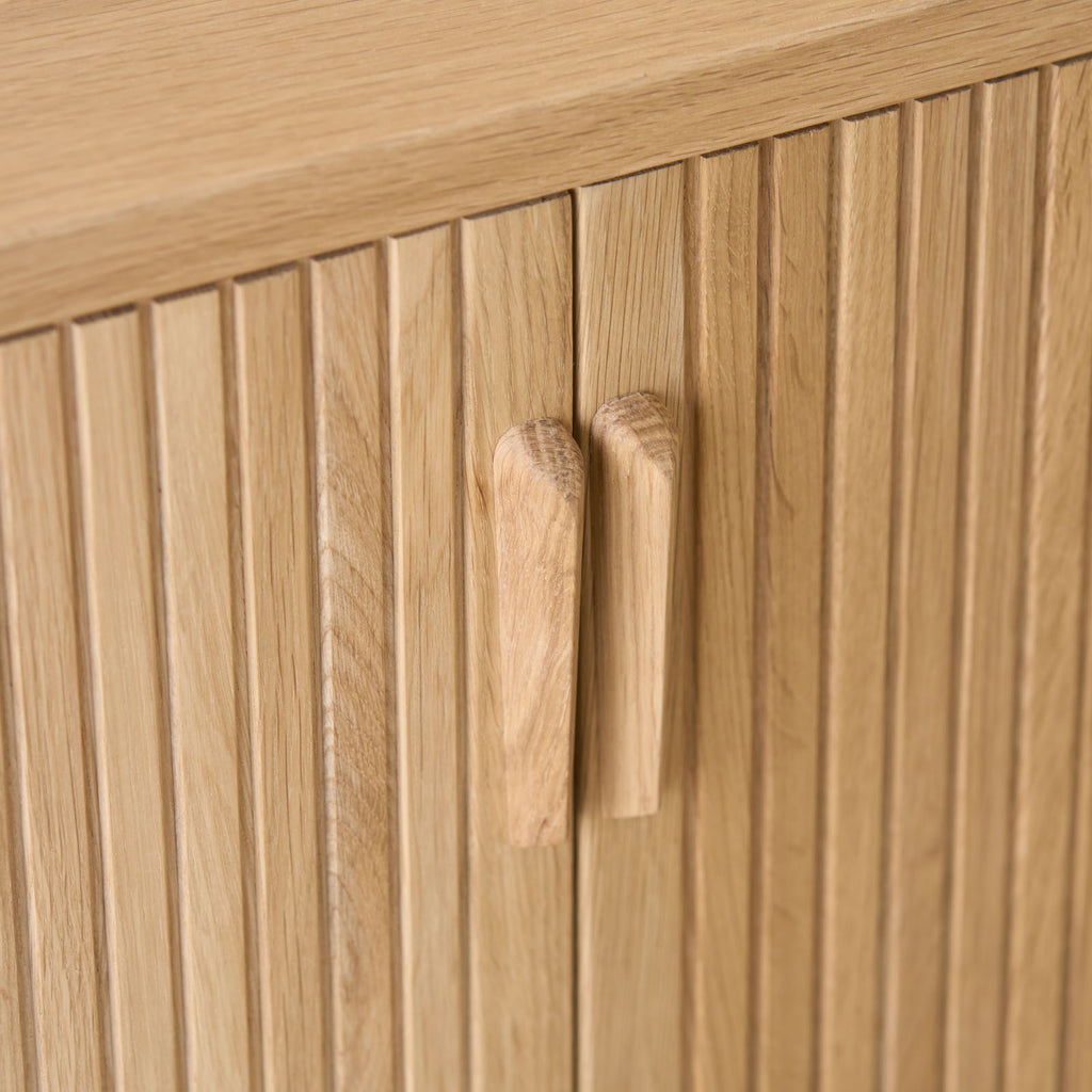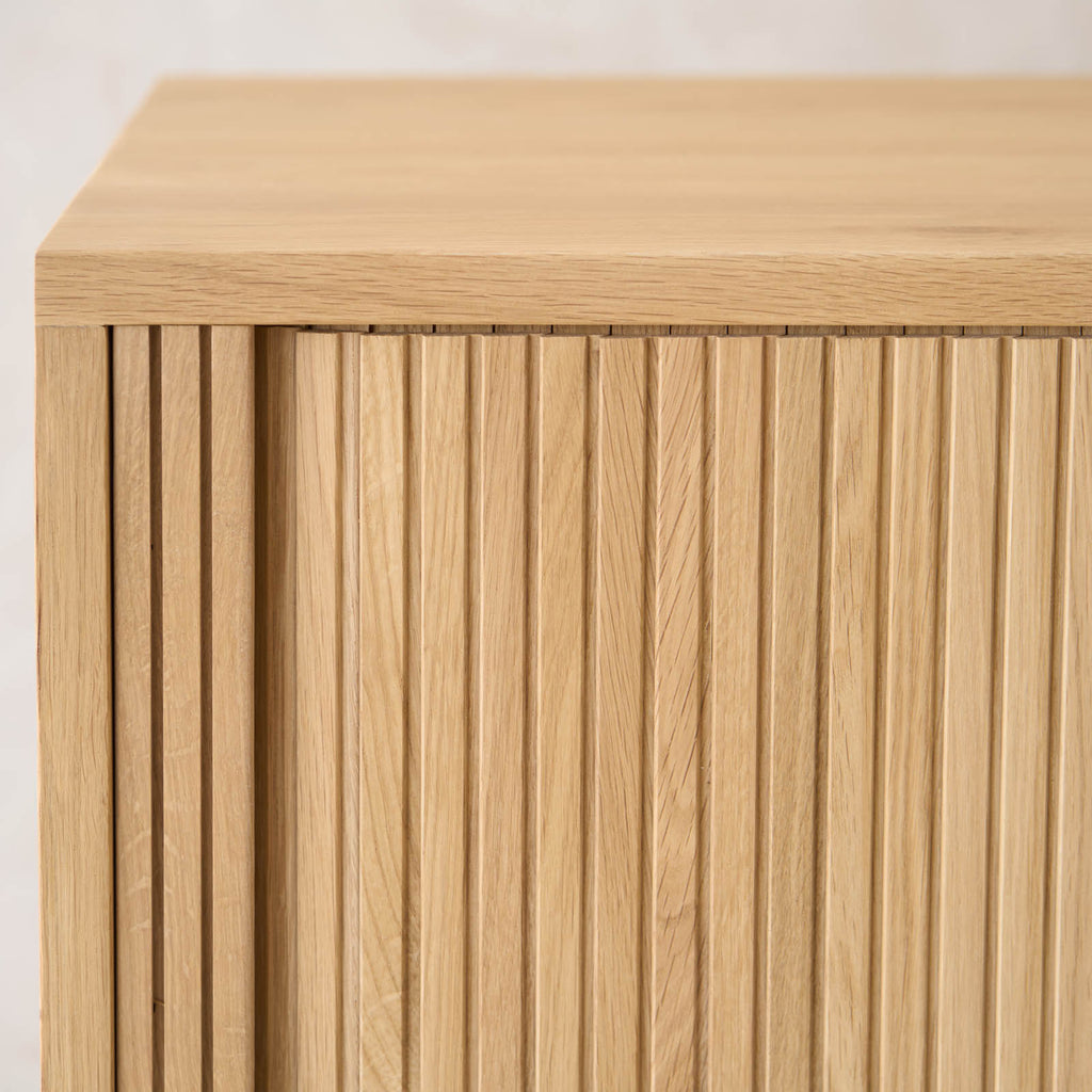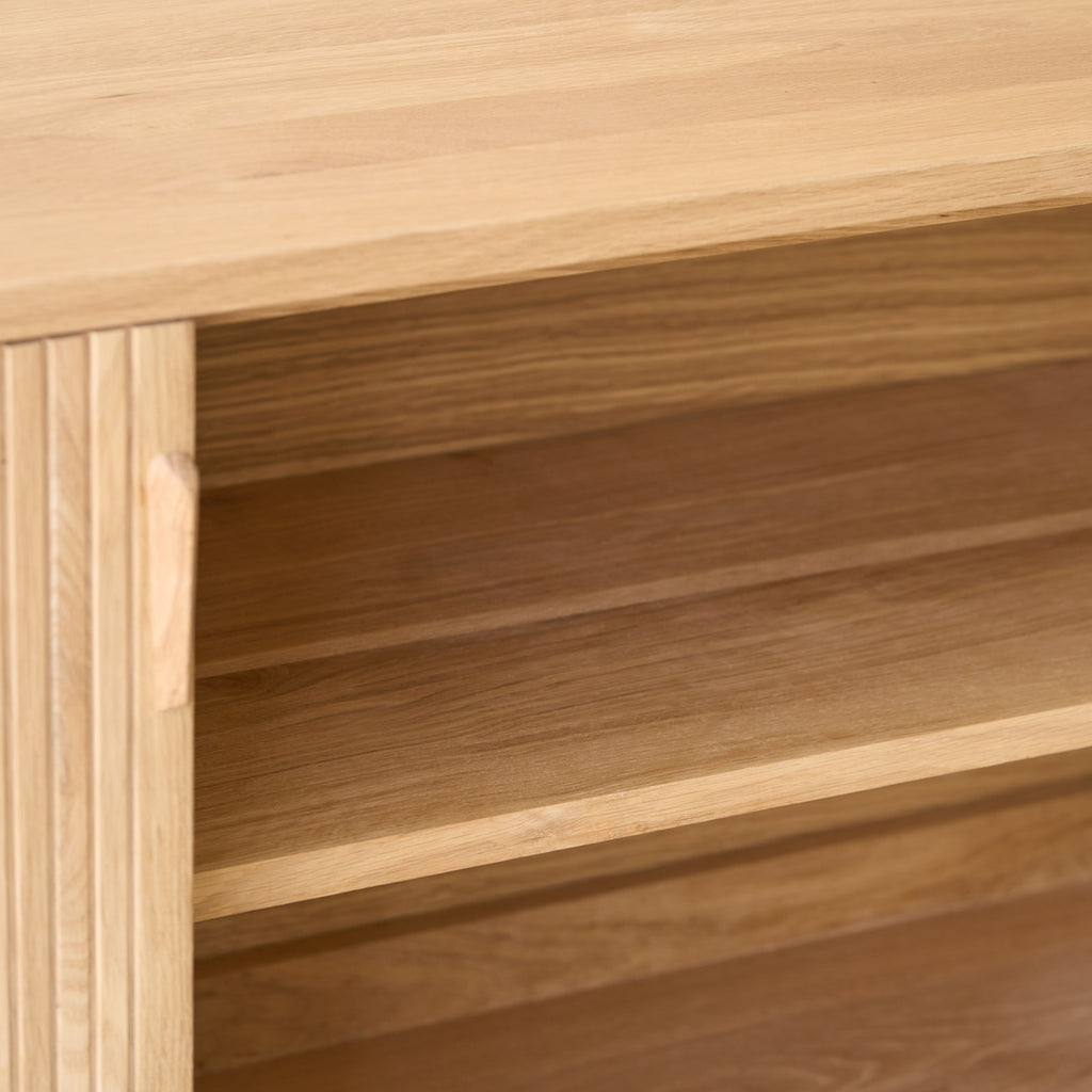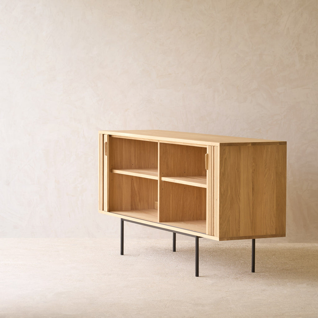 Made from solid oak timber. 2 fully-opening sliding doors. Adjustable shelves. Wipe timber to remove dust and dirt with a dry cloth. Wipe spills immediately using a damp cloth and natural soap, ensure you wipe the surface along the grain of the wood.