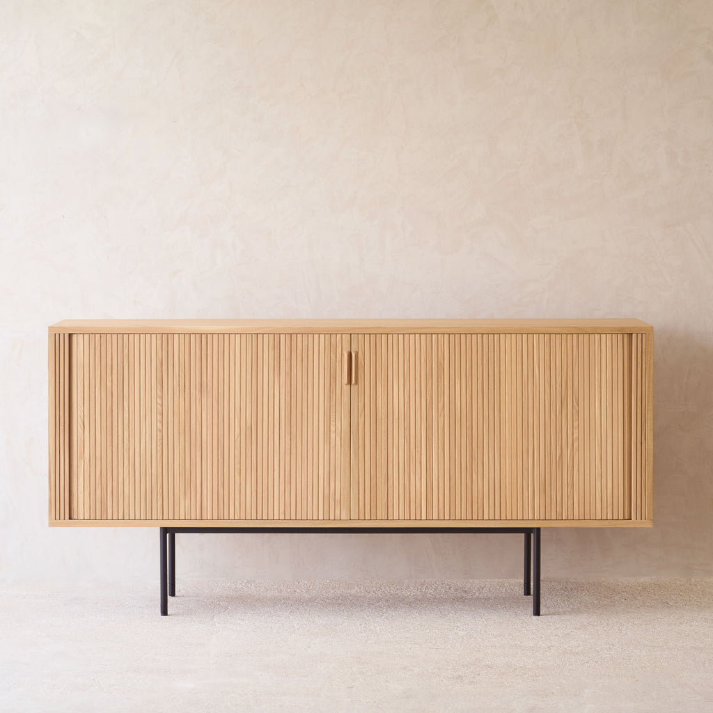 The sideboard features oak doors with a protective clear satin lacquer finish, while the legs are constructed from powder coated metal, ensuring both durability and a sophisticated appearance.