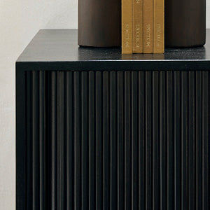 The Roller Max teak sideboard provides useful storage in a distinctive style. This piece, which elegantly displays the collection's stacked wood-stick style, has sliding doors, adjustable shelf, and perfectly incorporated handles.