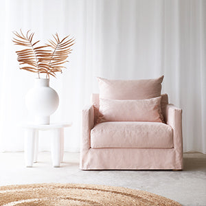 The Sloopy Armchair by Tolv offers a cosy retreat with its plush cushion and shabby-chic aesthetic. Whether lounging alone or entertaining guests, it brings a touch of casual elegance and enduring comfort to your home.