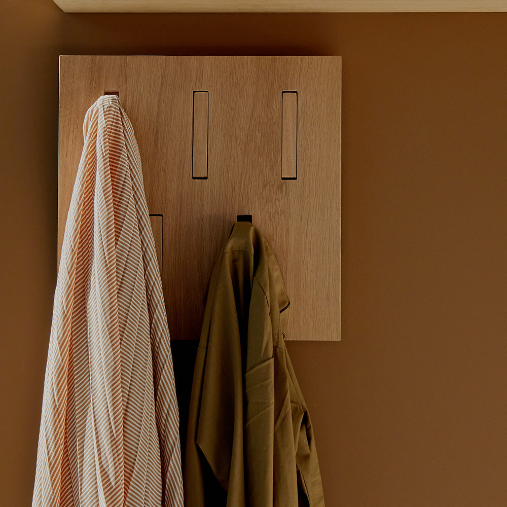 Minimalist and functional design, seamlessly blending form and function to enhance any hallway or entryway. Provides ample space for hanging coats, hats, and accessories while optimising wall space. Crafted from solid hardwood oak. For regular care, wipe the surface with a dry (lint-free) cloth. For oil and food stains use a damp cloth to wipe stains and follow with a clean dry cloth. Do not leave liquid to sit on timber surface as it will penetrate and may cause staining.