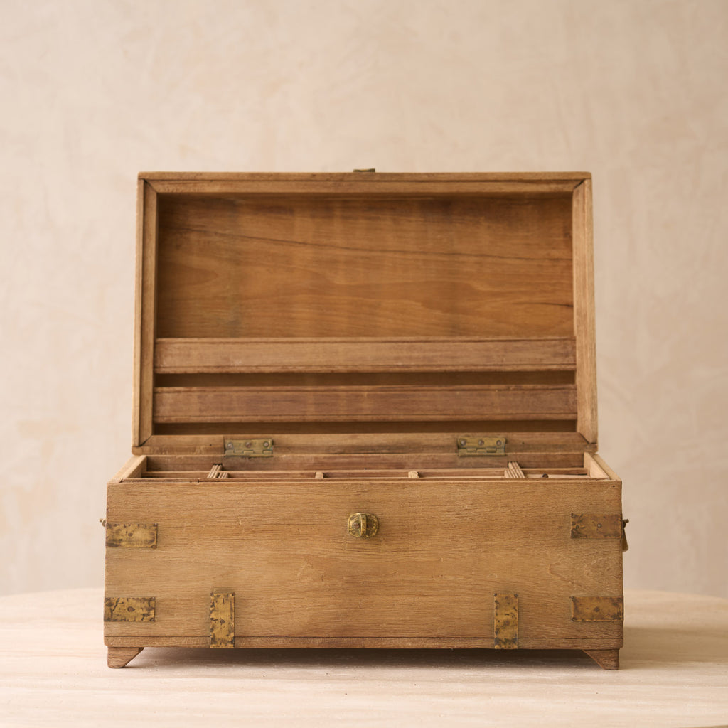 We source from the Northern most region of India, near the border of Pakistan, Rajasthan is home to artisan craftsman and hidden warehouses that produce the most unique and beautiful furniture pieces in the world. For 17 years, we have been on a search through these hidden places in Rajasthan, sourcing the pieces that speak to us and evoke the senses. Through a careful process, our carpenters remodel, reshape and restore the pieces we find on our journeys. The Vintage chests are crafted using repurposed teak wood panels from Rajasthan, India. Due to the scarcity of trees in the desert regions of Rajasthan and Gujarat, these chests were often made from multiple wooden panels.