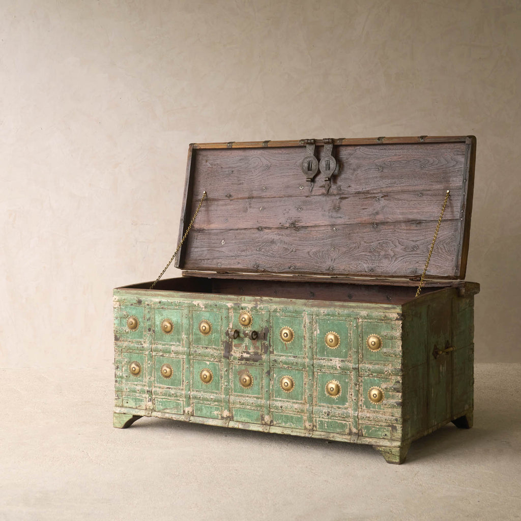 The Damchiya dowry chests (also known as Hope chests) are crafted using reclaimed teak wood panels from Rajasthan, India.