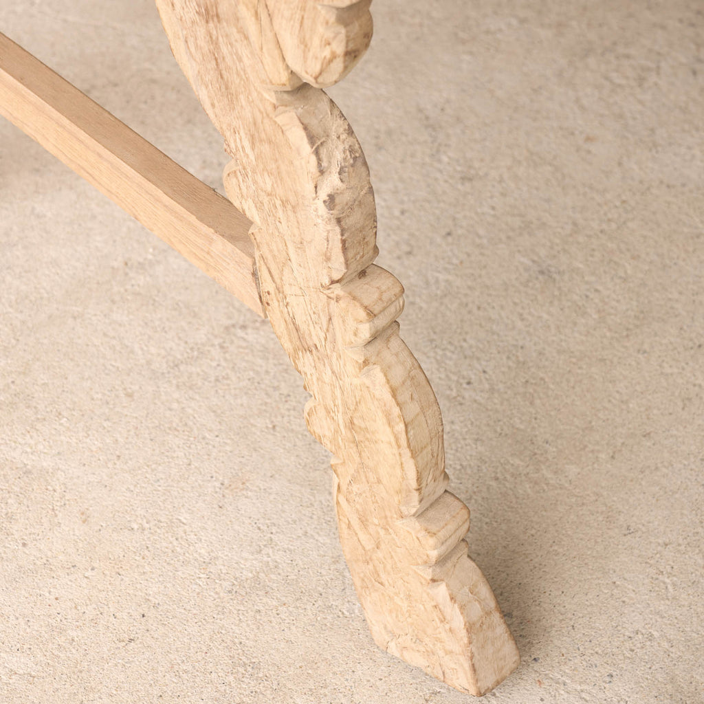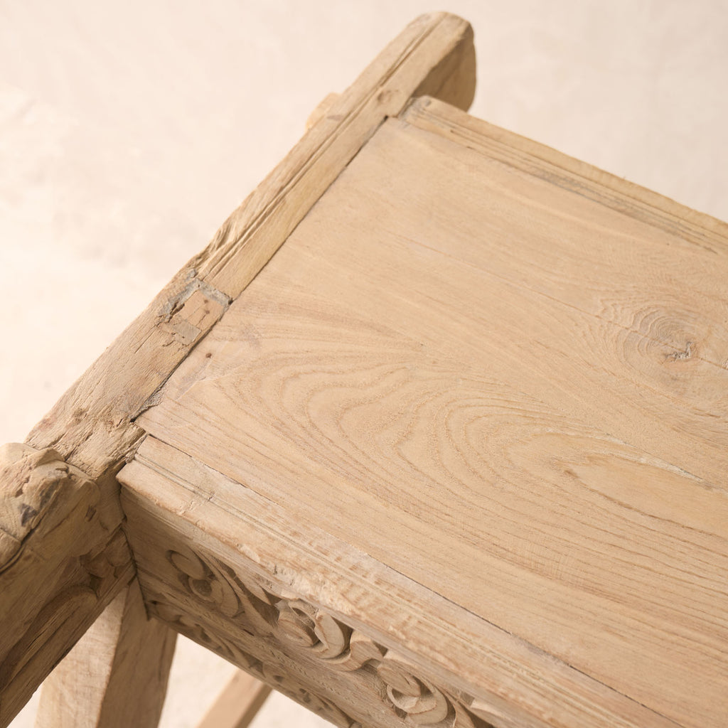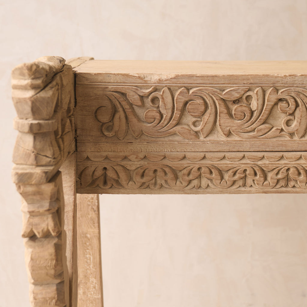 We source from the Northern most region of India, near the border of Pakistan, Rajasthan is home to artisan craftsman and hidden warehouses that produce the most unique and beautiful furniture pieces in the world. For 17 years, we have been on a search through these hidden places in Rajasthan, sourcing the pieces that speak to us and evoke the senses. Through a careful process, our carpenters remodel, reshape and restore the pieces we find on our journeys. Enhance your living space with a stunning Vintage Teak Console sourced from Rajasthan, India. With its unique character and exquisite restoration, this hand-carved piece is sure to make a statement in any room.