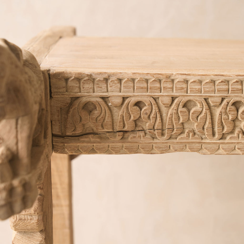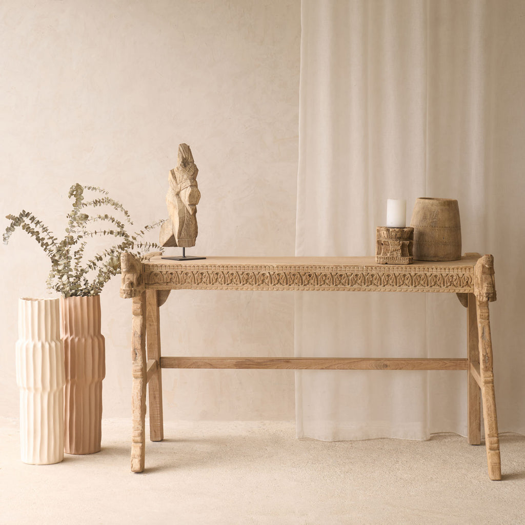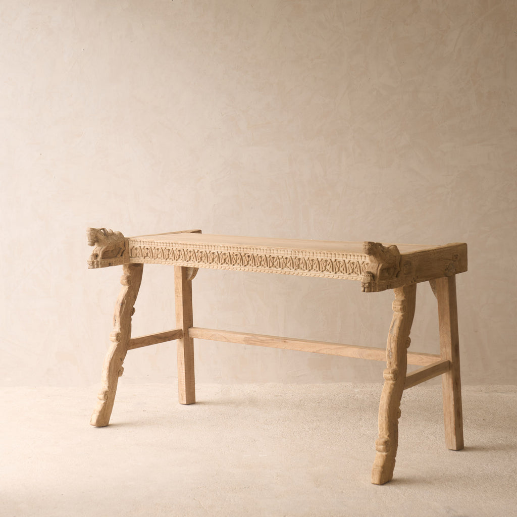 Enhance your living space with a stunning Vintage Teak Console sourced from Rajasthan, India. With its unique character and exquisite restoration, this hand-carved piece is sure to make a statement in any room.