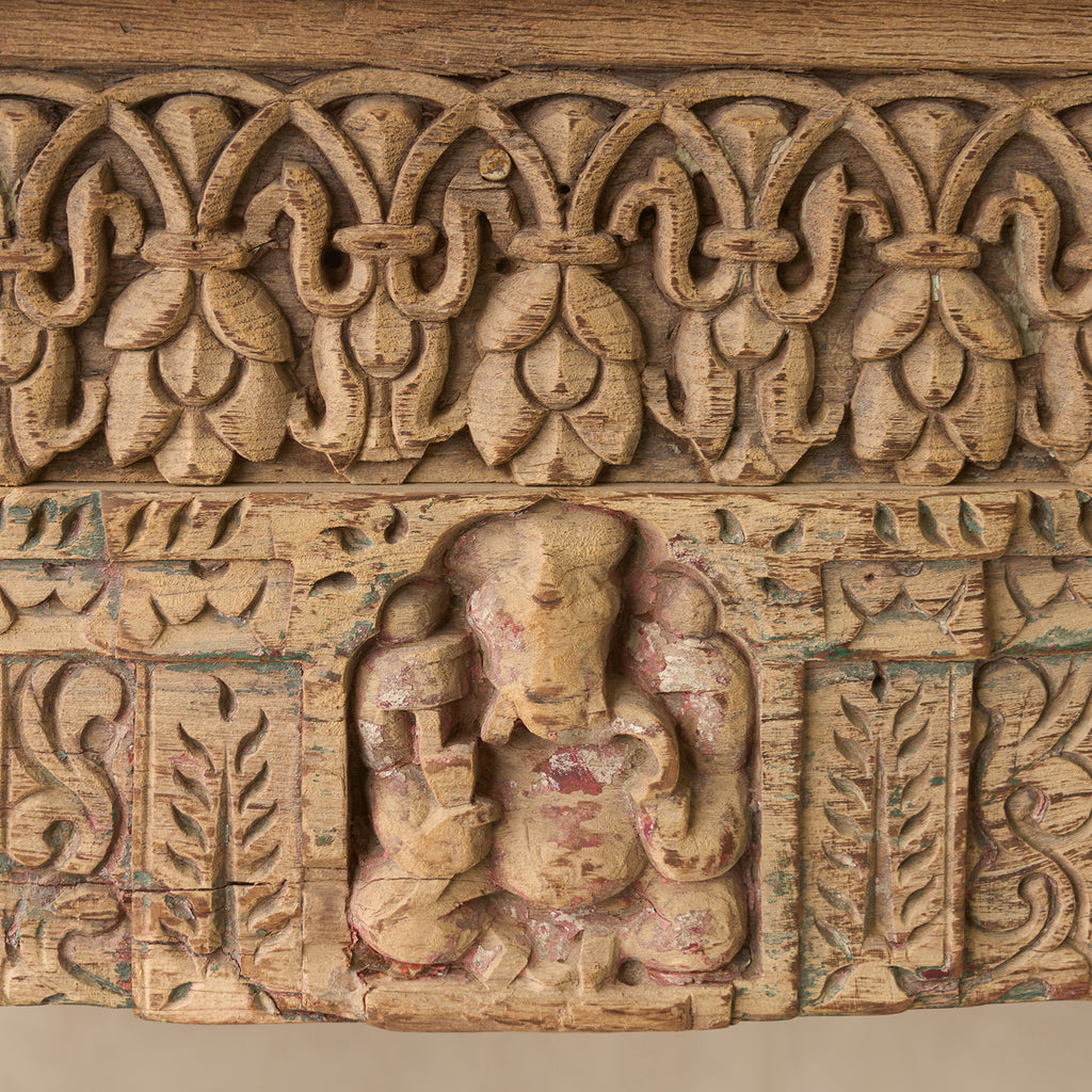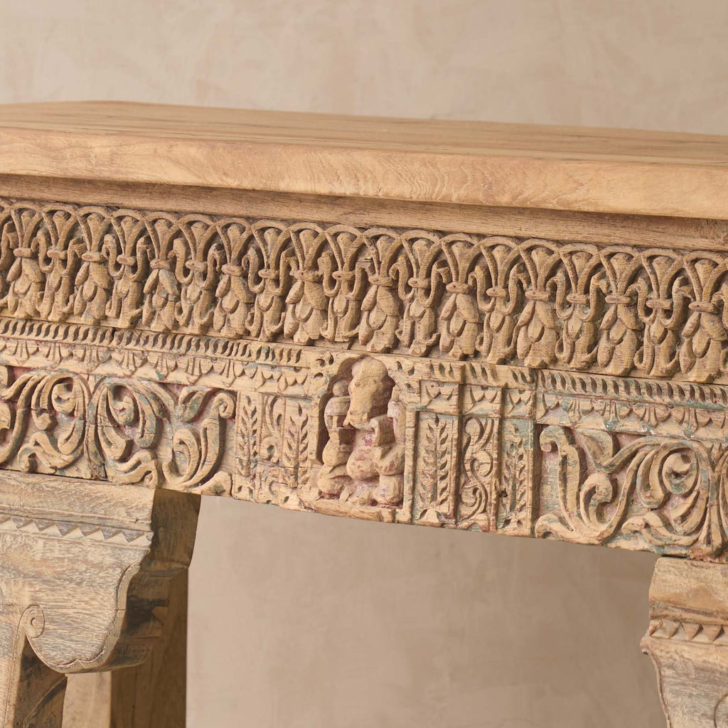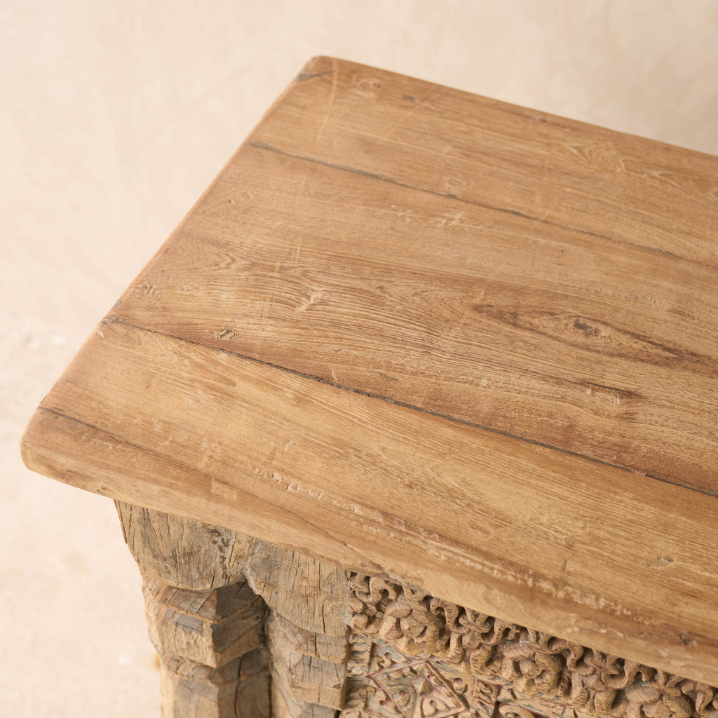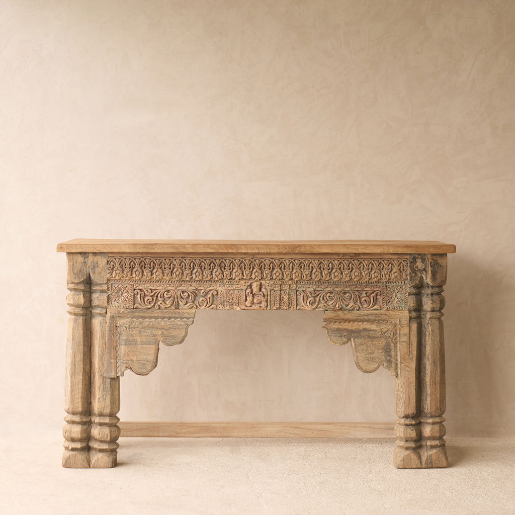 We source from the Northern most region of India, near the border of Pakistan, Rajasthan is home to artisan craftsman and hidden warehouses that produce the most unique and beautiful furniture pieces in the world. For 17 years, we have been on a search through these hidden places in Rajasthan, sourcing the pieces that speak to us and evoke the senses. Through a careful process, our carpenters remodel, reshape and restore the pieces we find on our journeys. Enhance your living space with a stunning Vintage Teak Console sourced from Rajasthan, India. With its unique character and exquisite restoration, this hand-carved piece is sure to make a statement in any room.