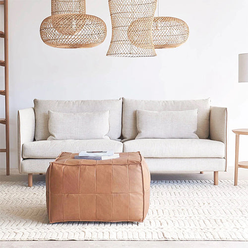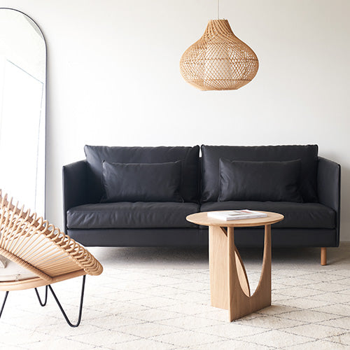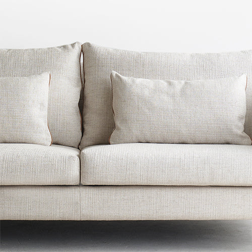 The Weekend Sofa is a perfect companion for your weekend relaxation. This sleek and modern sofa is designed to maximise seating space with its narrow arms. It features a durable fabric blend that exudes elegance, enhanced by contrasting leather details on the seams. It can also be covered beautifully in our premium top grain aniline leather with a contrasting detail on the seams. Make the Weekend Sofa the centerpiece of your weekend unwinding.
