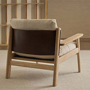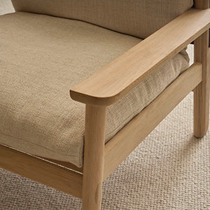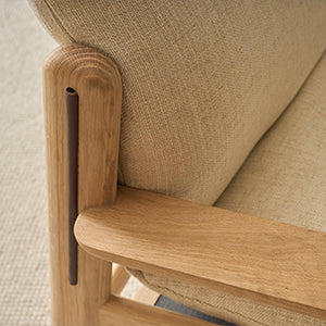 Designed by Cameron Foggo, the Wren Armchair blends timeless craftsmanship with natural elegance. Its solid oak frame features soft, hand-shaped curves and exposed joinery inspired by classic Danish woodworking. Solid american oak frame sprung with seat-belt webbing. Features a luxurious seating experience with multilayered high-density foam, complemented by a layer of feathers and ball-fiber filling for both the seat and back cushions. Backrest sling made from Sorensen harness leather. Both the seat and back cushions of this armchair are removable, offering convenient flexibility in maintenance and styling. For minor stains or marks, simply spot clean the armchair with a mild soap and water solution, ensuring easy maintenance and prolonged beauty. Maintain a clean appearance by occasionally lint rolling or lightly vacuuming the sofa to remove any accumulated dust.