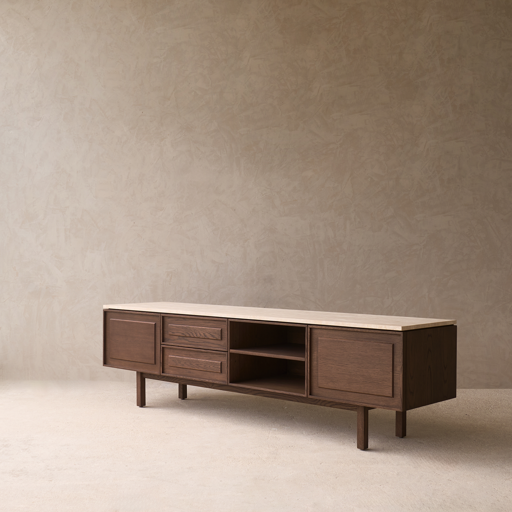 The Yorke TV Console radiate a serene sense of balance. Their skillfully designed paneled motif on the fronts serves as a subtle connection between the past and the present, adorning an otherwise minimal and sleek structure that maintains its poise through well-considered proportions.